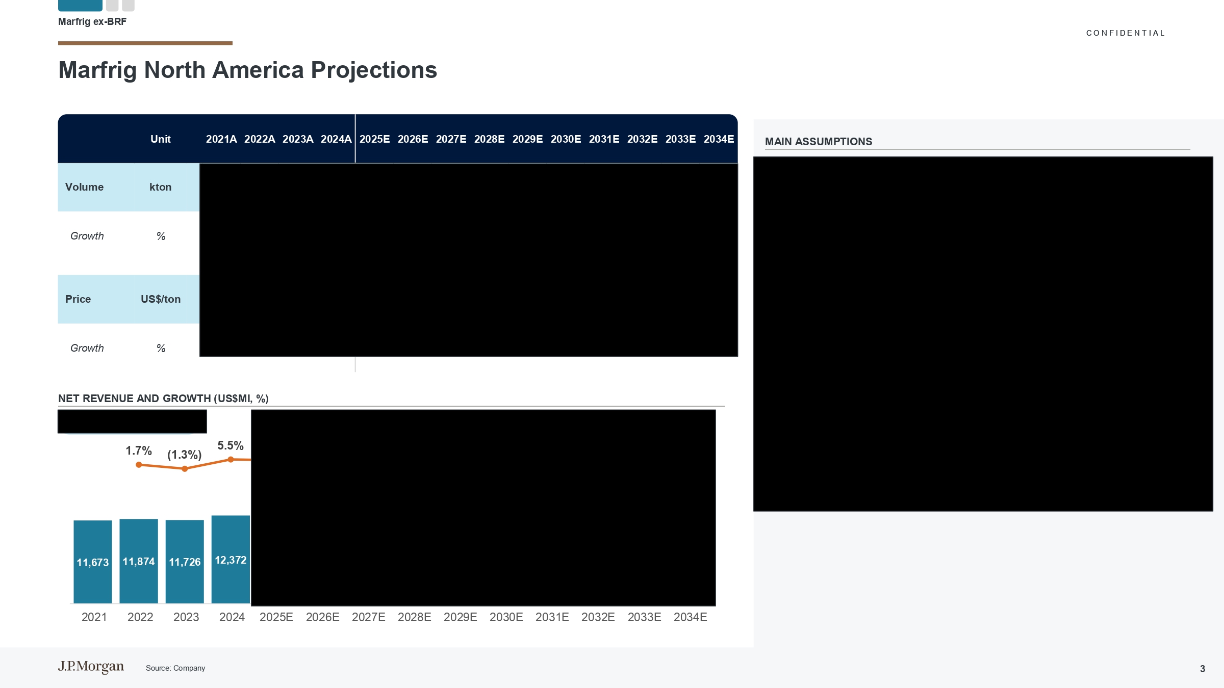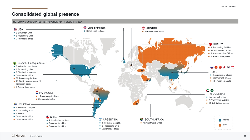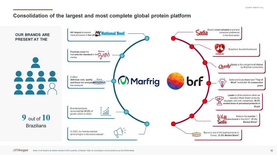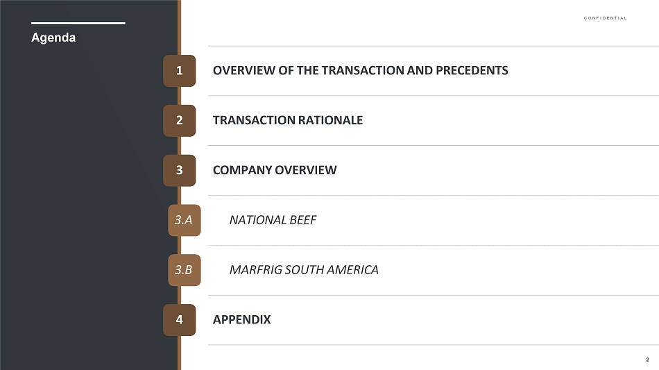 C O N F I D E N T I A L资料来源:公司10免责声明高度机密本演示文稿仅为Marfrig Global Foods S.A.的利益和内部使用而编制,该客户是直接向其发送和交付的客户(包括该客户的子公司,“公司”),以协助公司对一项或多项可能交易的可行性进行初步评估,确定该可能交易的适当结构,并就其财务方面进行谈判。这份材料只应结合摩根大通提供的口头简报进行分析和理解。本演示文稿不得全部或部分复制、重新分发或传播。未经摩根大通事先书面同意,不得披露本演示文稿及其任何内容或将其用于任何其他目的。此外,此演示文稿可能包含最初由AI或其他自动化技术生成的内容。所提供的信息基于已提供给摩根大通的预测,反映了当前状况和我们截至该日期的意见,如有更改,恕不另行通知。摩根大通不对可能收到的与交易有关的实际金额作出任何陈述,也不对达成交易的法律、税务或会计影响作出任何陈述。本演示文稿仅包含经济和财务分析,不涉及任何法律、监管或税务方面。本材料并不是为了用作公允性意见、估值报告或任何其他类似目的而编制的,因此,不应被视为公允意见、估值报告或任何其他类似目的。此外,根据经修订的1976年12月15日第6.404号法律(“巴西公司法”)第8条和/或《巴西公司法》第4、8、227、228、256或264条和/或巴西证券交易委员会(CVM)发布的任何决议、意见或条例,特别是第78号决议规定的决议、意见或条例,本演示文稿并未编制,也不应用于遵守巴西的任何法律、规则或条例的目的,包括但不限于为出资或资本形成的目的,85或160(包括其各自的附件)和/或为任何证券交易所发布的任何决议、意见或法规的目的,特别是B3 S/A-Brasil,Bolsa e Balc ã o。除非在此明确设想,本演示文稿中包含的信息未考虑可能的交易或涉及实际或潜在控制权变更的交易的影响,这些交易可能具有重大的估值和其他影响。摩根大通不对本演示文稿所载信息的准确性、完整性或可靠性作出任何明示或暗示的陈述或保证。第三方(公司除外)对本演示文稿所载信息的任何依赖均由该第三方承担风险。摩根大通不对因使用本演示文稿中包含的信息或其中包含的任何错误或遗漏而引起的任何损失或损害承担责任。在编制本演示文稿时,我们依赖并假定,在未经独立核实的情况下,从公开来源获得或由公司或代表公司提供给我们的所有信息的准确性、正确性、完整性和完整性。尽管有任何相反的情况,公司及其每一名雇员、代表或其他代理人可向任何和所有人(不限于任何种类)披露本协议所设想的交易的联邦和州所得税待遇以及联邦和州所得税结构,以及向公司提供的与此类税收待遇和税收结构有关的所有任何种类的材料(包括意见或其他税务分析),只要此类待遇和/或结构与银行向公司提供的联邦或州所得税策略有关。J. P. Morgan的数据隐私政策可查阅http://www.jpmorgan.com/pages/privacy。摩根大通是与美国证券交易委员会(Securities and Exchange Commission)就研究达成和解协议的一方,因此,摩根大通通常不被允许在投资银行业务提案中使用其研究部门的资源。这份报告中包含的所有观点都是摩根大通投行的观点,而不是研究部门的观点。摩根大通的政策禁止员工直接或间接提供有利的评级或特定价格目标,或提议改变相关公司的评级或价格目标,以换取或作为获得业务或付款的诱因。摩根大通还禁止其研究分析师因参与投行业务而获得报酬, 除非此类参与旨在使投资者受益。