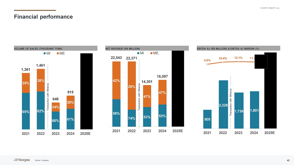 C O N F I D E N T I A L 58% 74% 53% 53% 52% 42% 26% 47% 47% 48% 22,54322,37114,30116,09720,00620212022202320242025E MI ME 65% 62% 66% 61% 61% 35% 35% 38% 34% 39% 1,3611,4616488 1596920212022202320242025E财务业绩销售额(千吨)MI ME净收入(百万雷亚尔)EBITDA AJ(百万雷亚尔)& EBITDA AJ Margin(%)与Minerva的交易与Minerva的交易与TERM9052,3281,7361,8012,1074.0% 10.4%资料来源:公司43