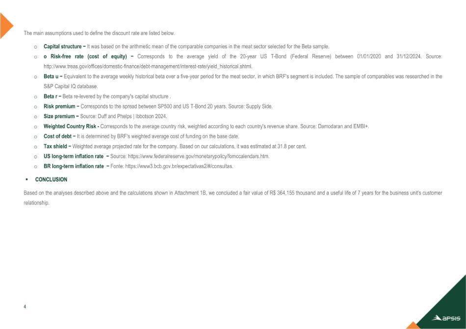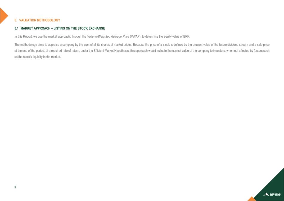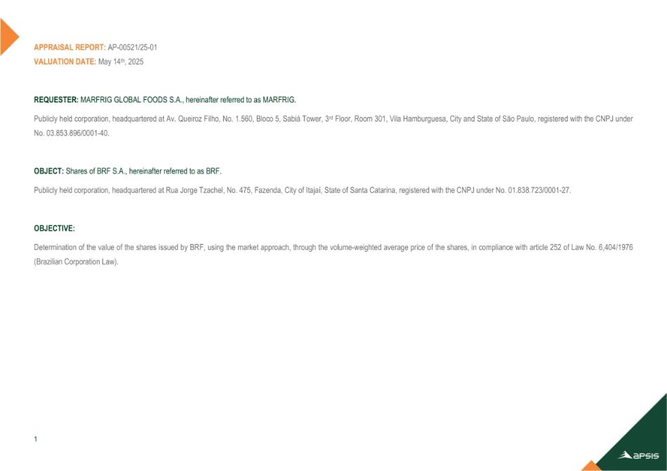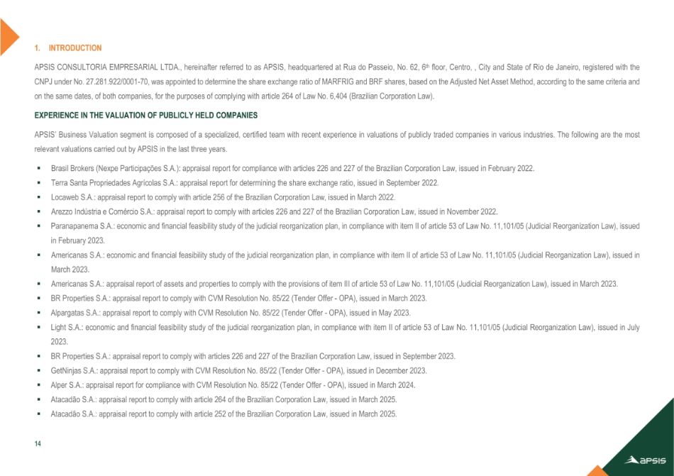 | (四) | 批准委任Apsis Consultoria Empresarial Ltda.为负责编制(a)评估报告的评估公司,该评估报告按市值计算,由拟并入公司的BRF发行的股份,在合并范围内(“合并评估报告”)和b)载有计算BRF非控股股东所持股份交换比例的评估报告,根据巴西公司法第264条(“评估报告264”); |