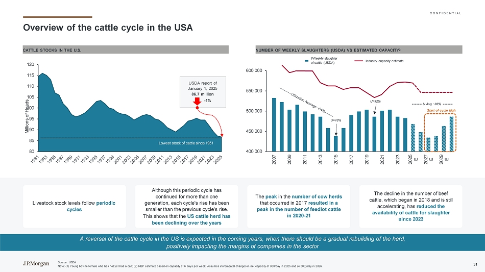 C O N F I D E N T I A L Marfrig在生态系统的每一步都增加了价值,致力于有利于整个生态系统福祉的项目,包括医学研究,以及消费者和动物营养领域的领导者和创新者在湿蓝色皮革加工行业1可持续-产品:对动物健康、消费和营养的贡献医疗进步心包袋,支持医疗进步和程序,以改善生活从果冻到蜡笔等消费用品,National Beef在日常消费品中提供范围广泛的项目动物营养,从牛油到肉和骨粉,我们在提供用于优化动物饮食的产品方面处于领先地位,皮革循环安装加工来自National Beef Industry/Retail与畜牧业农民的强大联盟中西部畜牧业地区人类实践皮革整理和制造印刷、染色等。皮革湿蓝国民牛肉国民牛肉世界上最大、最具科技含量的湿蓝装置皮肤牛肉动物营养奖在为豪华鞋业和汽车行业提供皮革方面创造价值C O N F I D E N T I A L来源:公司注:(1)生产湿蓝优质皮革以提供更好的切割性能和改进的染料吸收,从而可以提高工艺效率和成本节约。30