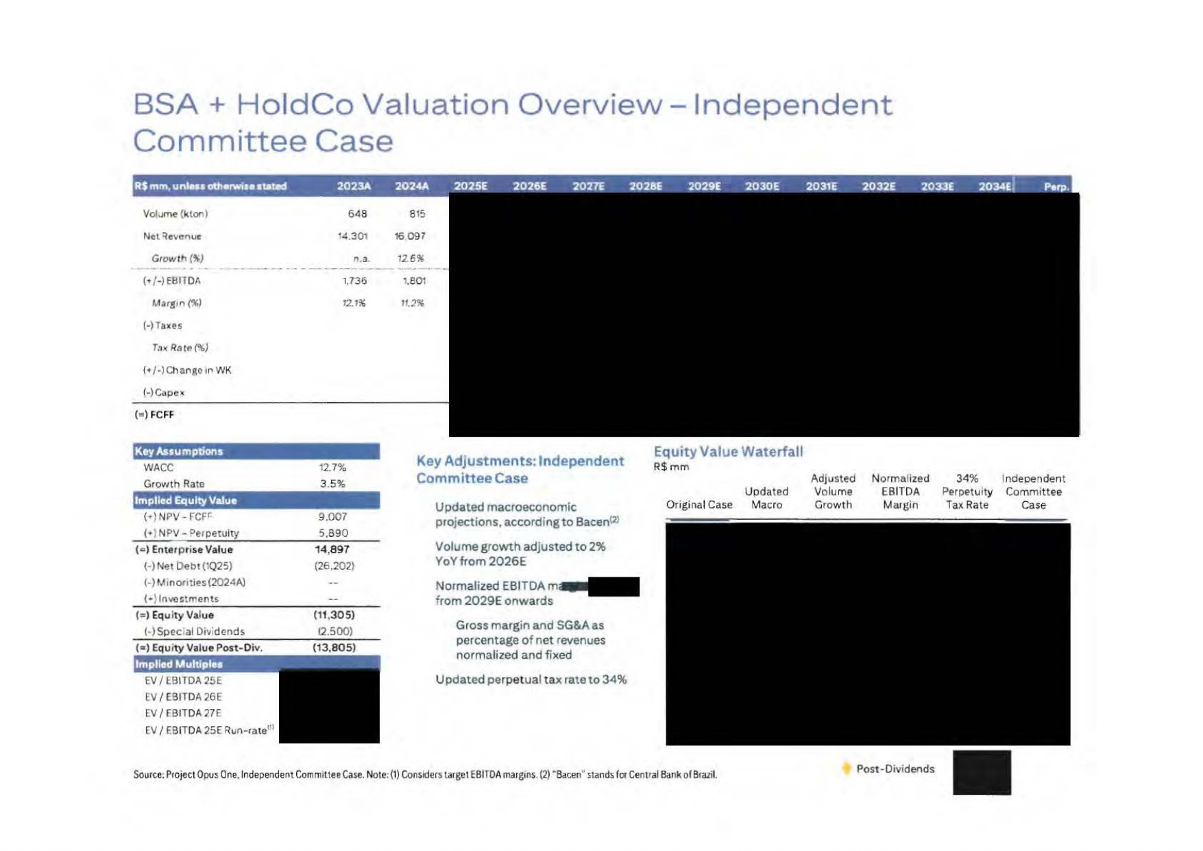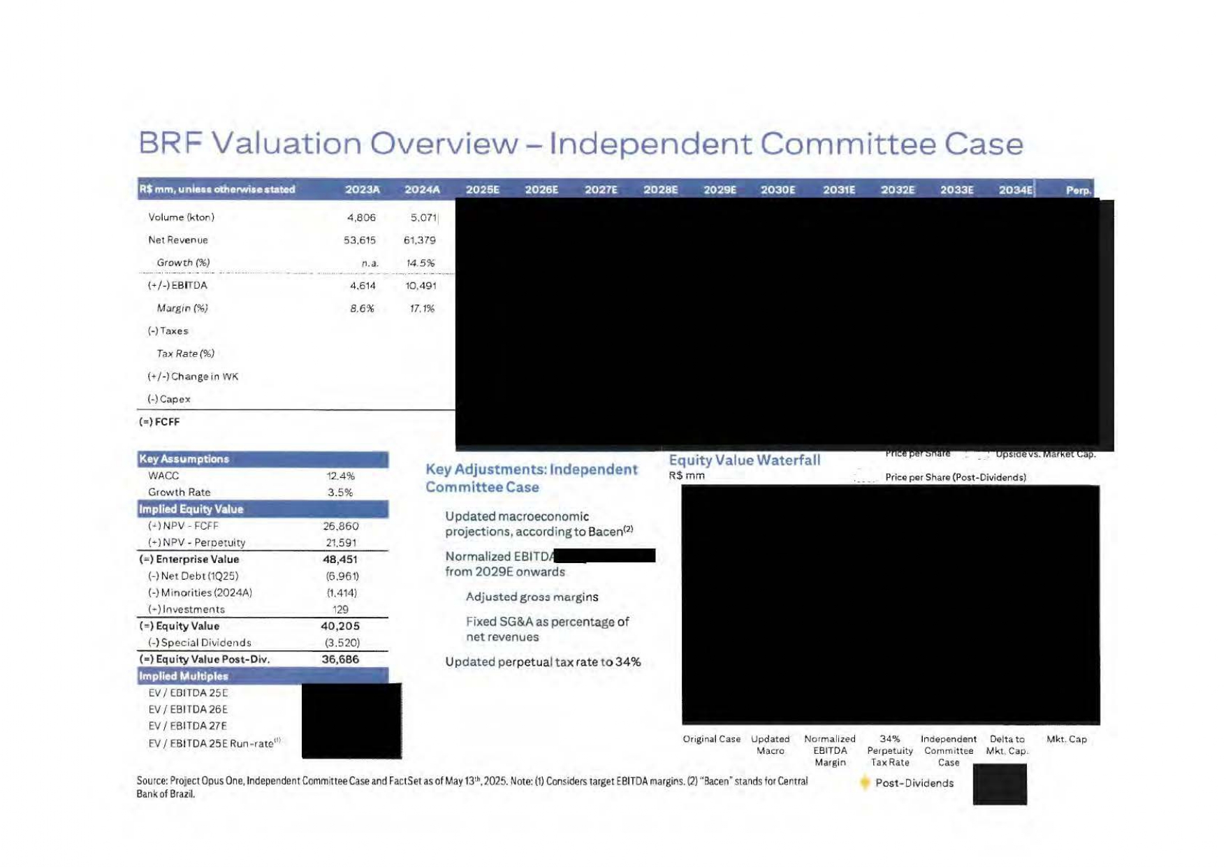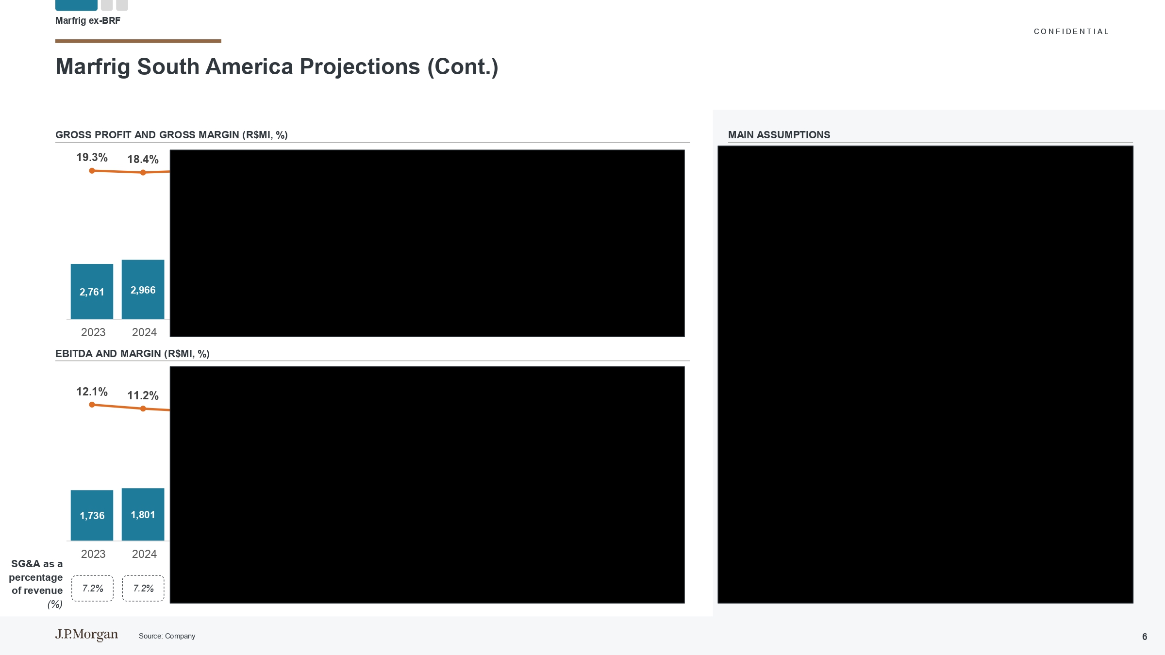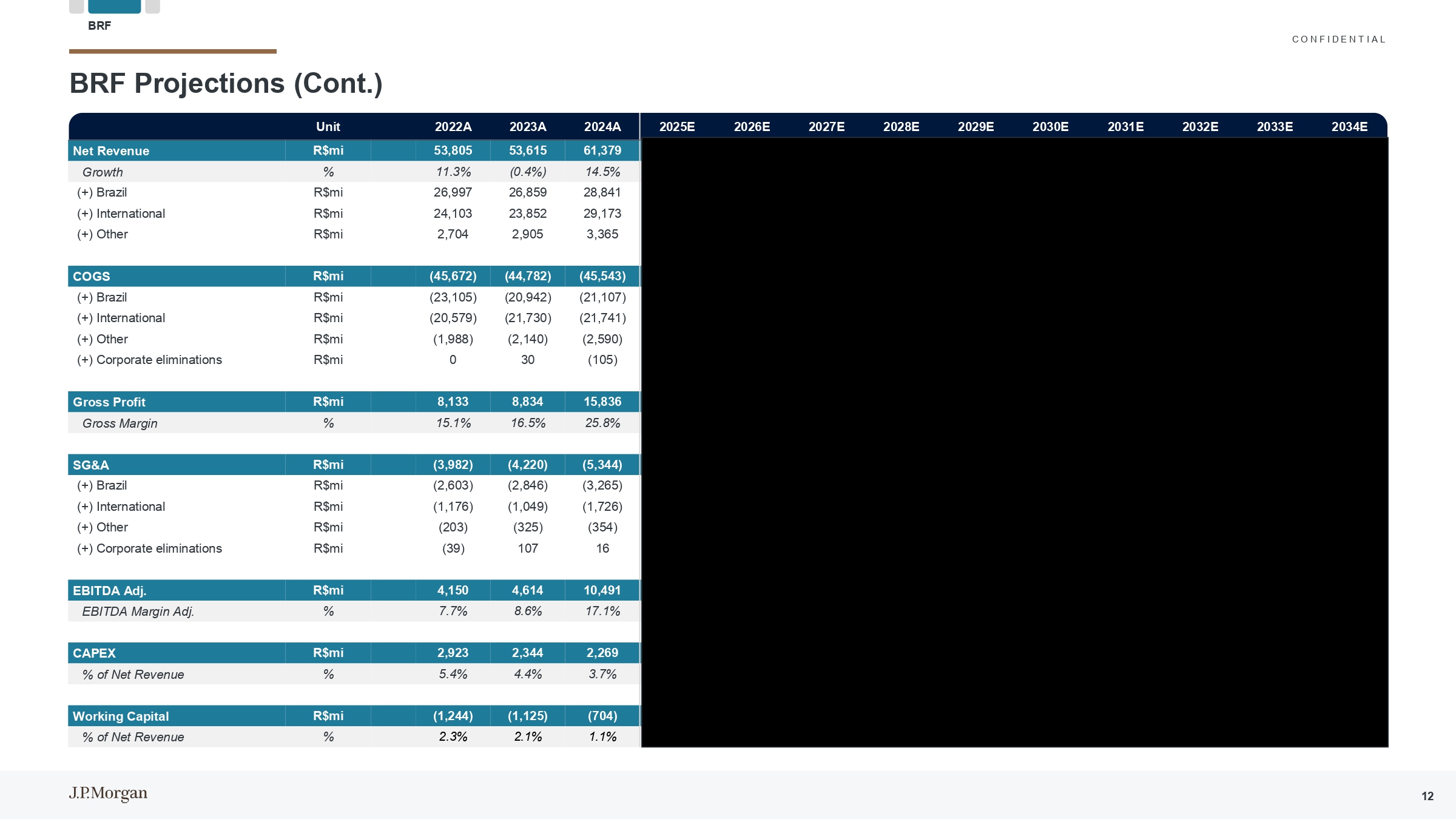 C O N F I D E N T I A L 2034E 2033E 2032E 2031E 2030E 2029E 2028E 2027E 2026E 2025E 2024A 2023A单位160,353151,791143,171134,070125,099116,313113,412108,359104,28695,97483,01872,771 R $ mi净收入5.6% 6.0% 6.8% 7.2% 7.6% 2.6% 4.7% 3.9% 8.7% 15.6% 14.1%增长(142,135)(132,059)(125,143)(117,609)(110,200)(104,371)(103,199)(100,794)(96,591)(89,304)(77,074)(66,213)R $ mi COGS 18,21819,772(4,571)(4,209)(4,013)(3,907)(3,822)(3,957)(3,351)(2,579)(2,519)R $ mi SG & A 3.3% 3.3% 3.3% 3.4% 3.4% 3.4% 3.5% 3.5% 3.5% 3.5% 3.8% 3.5% 3.1% 3.5% %净收入12,84814,67013,21411,89010,6907,9306,3053,7433,7383,3193,3664,040 R $ mi EBITDA Adj. 8.0% 9.7% 9.2% 8.9% 8.5% 6.8% 5.6% 3.5% 3.6% 3.5% 3.5% 4.1% 5.6% EBITDA Margin Adj. Marfrig North and South America Projections Marfrig ex-BRF 8