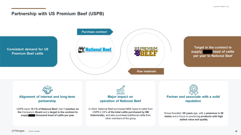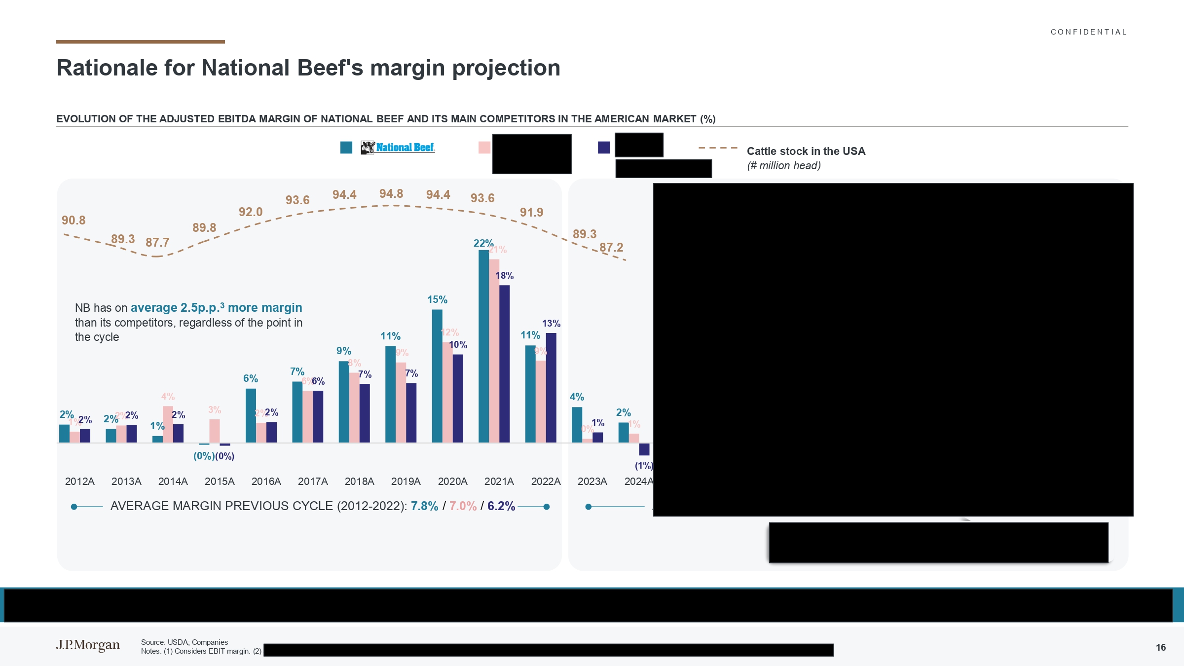 C O N F I D E N T I A L 1% 6% 9% 11% 15% 22% 11% 4% 2% 1% 4% 6% 8% 9% 9% 10% 8% 1% 4% 3% 8% 12% 21% 9% 0% 1% 2% 2% 2% 2% 2% 2% 2% 7% 6% 7% 7% 7% 10% 18% 18% 13% 1% 2012A 2022A 2023A(1%)2024A 90.889.387.789.89 2.09 3.69 4.49 4.49 4.49 1.989.387.2对于National Beef的利润率预测演变NATIONAL BEEF及其在美国市场的主要竞争对手的调整后EBITDA利润率(%)牛肉细分市场1牛肉北美2美国牛库存(#百万头)NB平均有2。5页p。比竞争对手多3个利润率,不考虑周期中的点位(0%)(0%)2013A2014A2015A2016A2017A2018A2019A2020A2021A平均利润率上一个周期(2012-2022年):7.8%/7.0%/6.2% 2025E 2026E 2027E 2028E 2029E 2030E 2031E 2032E 2033E 2034E平均利润率预测周期(2023-2034E):5。对国家牛肉利润率的预测采用了4%的保守假设。预计的平均利润率低于上一个周期的国家牛肉本身及其竞争对手考虑到历史利润率之间的平均价差,泰森和JBS的利润率将分别为4.6%和3.7%,来源:USDA;公司注意:(1)考虑息税前利润率。(2)JBS Beef North America考虑美国、加拿大和澳大利亚的生产结果。截至2022年,该公司开始单独报告JBS澳大利亚。(三)2016年以来16