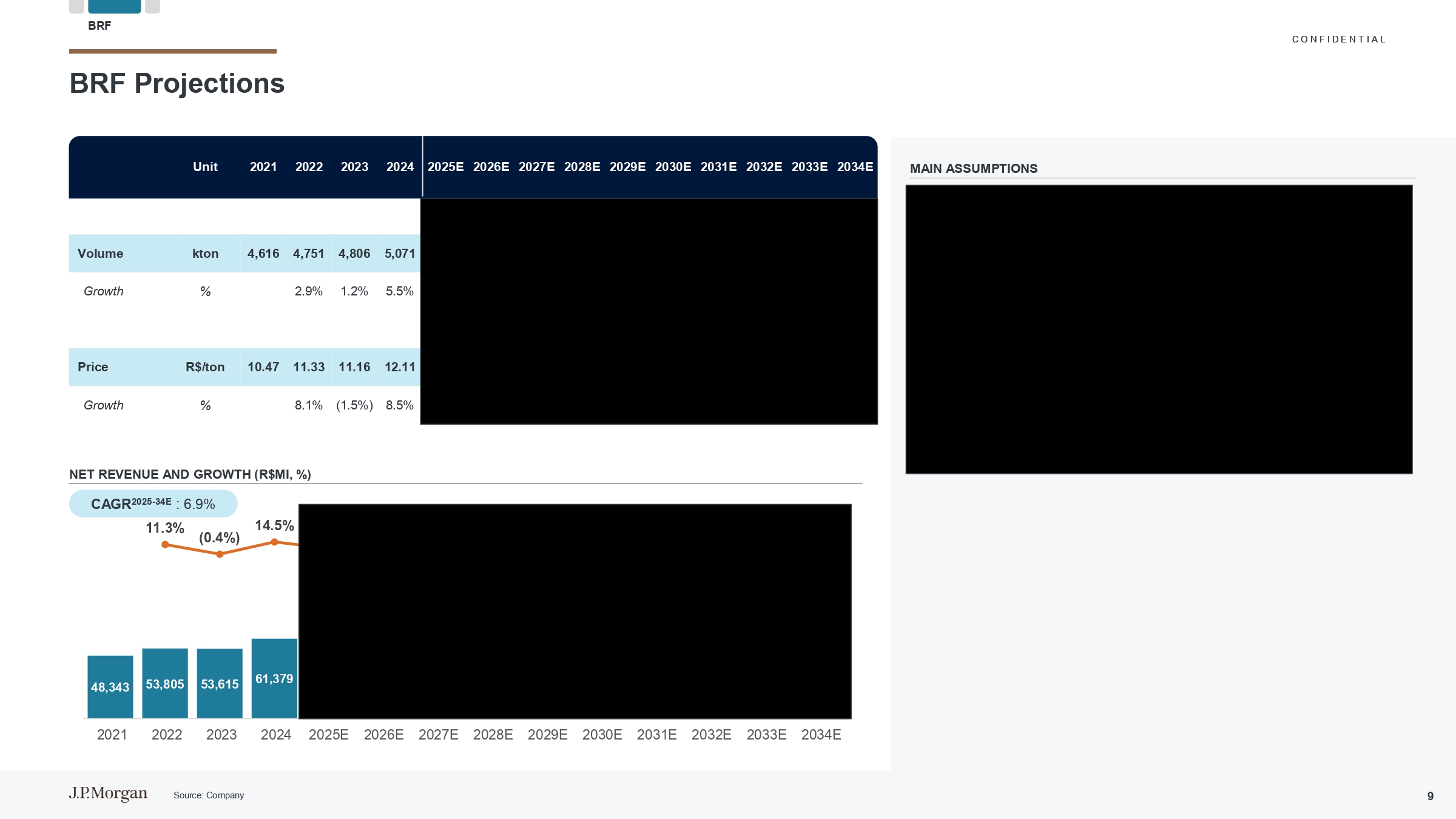 C O N F I D E N T I A L毛利润和毛利率(R $ MI,%)主要假设9,6938,1338,83415,83615,52216,52916,10416,53417,03318,06819,52721,29823,00124,75820.0% 15.1% 16.5% 25.8% 23.7% 23.3% 21.2% 20.6% 19.9% 19.8% 20.0% 20.4% 20.6% 20.8% 2026e2027e2028e2029e2029e2029e2030e2031e2032e2033e2034e2034e鉴于在执行过去两年实施的卓越运营计划后达到的盈利水平正常化,预计公司的利润率将小幅下降,从而获得了显着的效率提升并产生了强劲的利润率扩张BRF新的董事会和高管的卓越管理已将收入从2023年的540亿雷亚尔(EBITDA利润率为8.6%)提高到2024年的610亿雷亚尔(EBITDA利润率为17.1%)。这些结果已将公司定位于正常化水平,对未来长期持续受益的预期,预计将保持稳定的增长轨迹,在有利的周期位置内不发生重大变化,对利润率正常化的BRF预测(续)20212022202320242025E EBITDA和利润率(R $ MI,%)5,7024,1504,61410,4919,85510,3809,4879,5149,56010,08711,00312,19313,27614,37211.8% 7.7% 8.6% 17.1% 15.1% 14.6% 12.5% 11.8% 11.2% 11.0% 11.3% 11.7% 11.9% 12.1% 20212022202320242025E 2026E 2027E 2028E 2029E 2030E 2031E 2032E 2033E 2034E SG & A占收入的百分比(%)8.3% 7.4% 7.9% 8.7% 8.7% 8.7% 8.7% 8.7% 8.7% 8.7% 8.7% 8.7% 8.7% 8.7% 8.7% 8.7% 8.7% 8.7% 8.7% 8.7% BRF资料来源:公司10