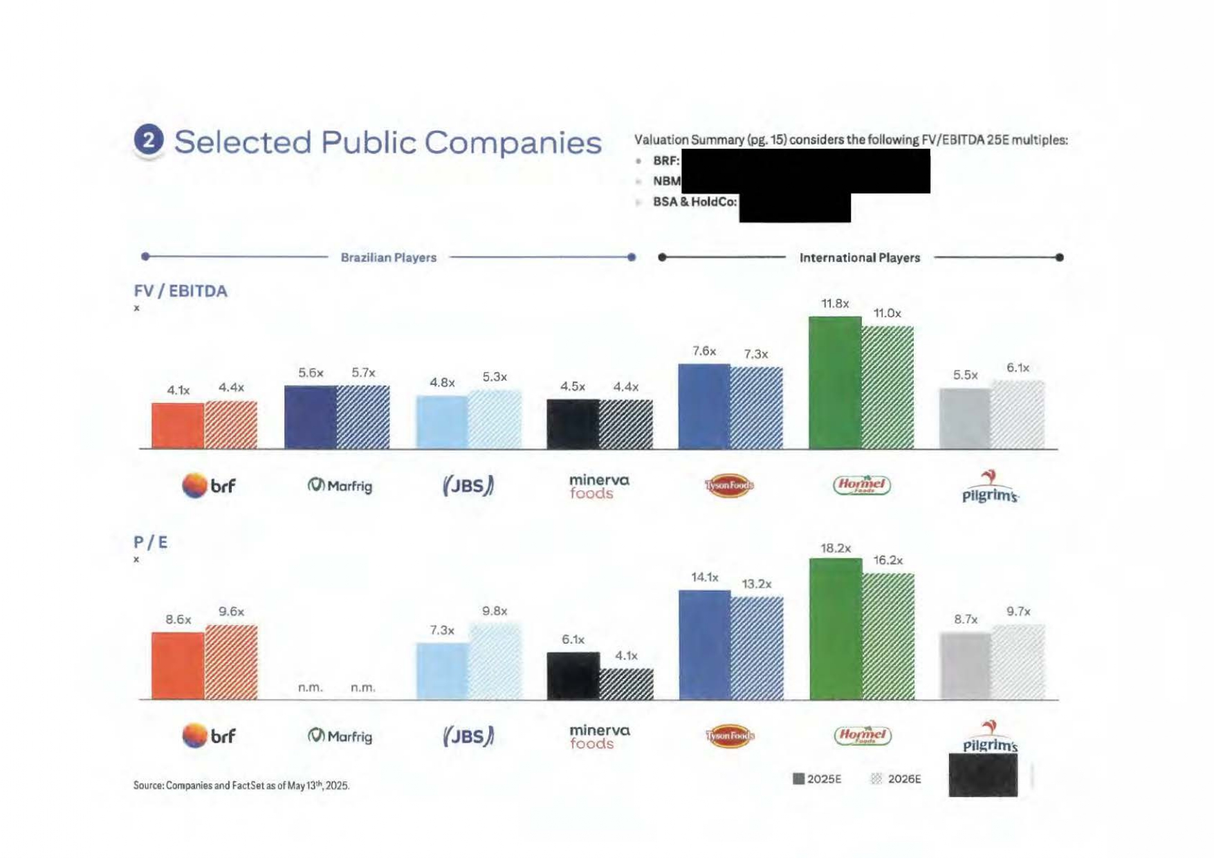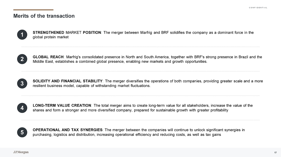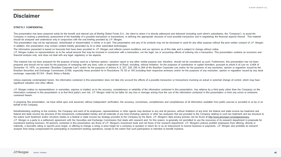 C O N F I D E N T I A L资料来源:公司46免责声明高度机密本演示文稿仅为Marfrig Global Foods S.A.的利益和内部使用而编制,Marfrig Global Foods S.A.是其直接指向和交付的客户(包括该客户的子公司,“公司”),以协助公司对一项或多项可能交易的可行性进行初步评估,确定该可能交易的适当结构,并就其财务方面进行谈判。这份材料只能结合摩根大通提供的口头简报来分析和理解。本演示文稿不得全部或部分复制、重新分发或传播。未经摩根大通事先书面同意,不得披露本演示文稿及其任何内容或将其用于任何其他目的。此外,此演示文稿可能包含最初由AI或其他自动化技术生成的内容。所提供的信息基于已提供给摩根大通的预测,反映了当前状况和我们截至该日期的意见,如有更改,恕不另行通知。摩根大通不对可能收到的与交易相关的实际金额以及达成交易的法律、税务或会计影响作出任何陈述。本演示文稿仅包含经济和财务分析,不涉及任何法律、监管或税务方面。本材料的编制并不是为了用作公允意见、估值报告或任何其他类似目的,因此,不应被视为公允意见、估值报告或任何其他类似目的。此外,根据经修订的1976年12月15日第6.404号法律(“巴西公司法”)第8条和/或巴西公司法第4、8、227、228、256或264条和/或巴西证券交易委员会(CVM)发布的任何决议、意见或条例,特别是第78号决议规定的决议、意见或条例,本演示文稿并未编制,也不应用于遵守巴西的任何法律、规则或条例的目的,包括但不限于为出资或资本形成的目的,85或160(包括其各自的附件)和/或为任何证券交易所发布的任何决议、意见或法规的目的,特别是B3 S/A-Brasil,Bolsa e Balc ã o。除非在此明确设想,本演示文稿中包含的信息未考虑到可能的交易或涉及实际或潜在控制权变更的交易的影响,这些交易可能具有重大的估值和其他影响。摩根大通对本演示文稿所载信息的准确性、完整性或可靠性不作任何明示或暗示的陈述或保证。第三方(公司除外)对本演示文稿所载信息的任何依赖均由该第三方承担风险。摩根大通不对因使用本演示文稿中包含的信息或其中包含的任何错误或遗漏而引起的任何损失或损害承担责任。在编制本演示文稿时,我们依赖并假定,在未经独立核实的情况下,从公开来源获得或由公司或代表公司提供给我们的所有信息的准确性、正确性、完整性和完整性。尽管有任何相反的情况,公司及其每一名雇员、代表或其他代理人可向任何和所有人(不限于任何种类)披露在此设想的交易的联邦和州所得税待遇以及联邦和州所得税结构,以及向公司提供的与此种税收待遇和税收结构有关的所有种类的材料(包括意见或其他税收分析),只要此种待遇和/或结构与银行向公司提供的联邦或州所得税策略有关。摩根大通的数据隐私政策可查阅http://www.jpmorgan.com/pages/privacy。摩根大通是与美国证券交易委员会(Securities and Exchange Commission)达成的一项涉及研究的和解协议的一方,因此,摩根大通通常不被允许在投资银行业务的提案中使用其研究部门的资源。这份报告中包含的所有观点都是摩根大通投行的观点,而不是研究部门的观点。摩根大通的政策禁止员工直接或间接提供有利的评级或特定价格目标,或提议改变相关公司的评级或价格目标,以换取或作为获得业务或付款的诱因。摩根大通还禁止其研究分析师因参与投行业务而获得报酬, 除非此类参与旨在使投资者受益。