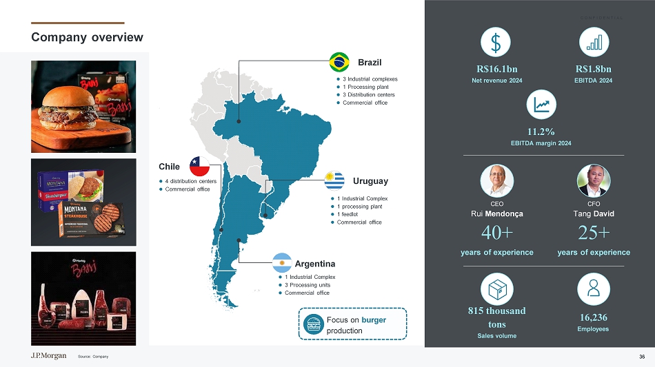 C O N F I D E N T I A L在南美的运营亮点分销智利最大的分销商在智利生产多样化产业综合体遍布3个国家多元化投资组合专注于工业化产品,拥有优质品牌和市场ESG实践国际认可的Marfrig Green +计划,第一个实现100%可追溯性和减少碳足迹的品牌全球出口到100多个国家来源:公司35