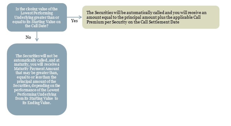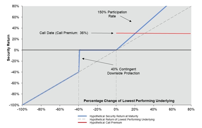 如果证券被自动赎回,该证券的正回报将限于看涨期权溢价,即使收盘价值的表现最低认购日的标的大幅超过其起始值。如果证券被自动调用,y你不会有机会参与任何赞赏任何 底层处于上行参与率.