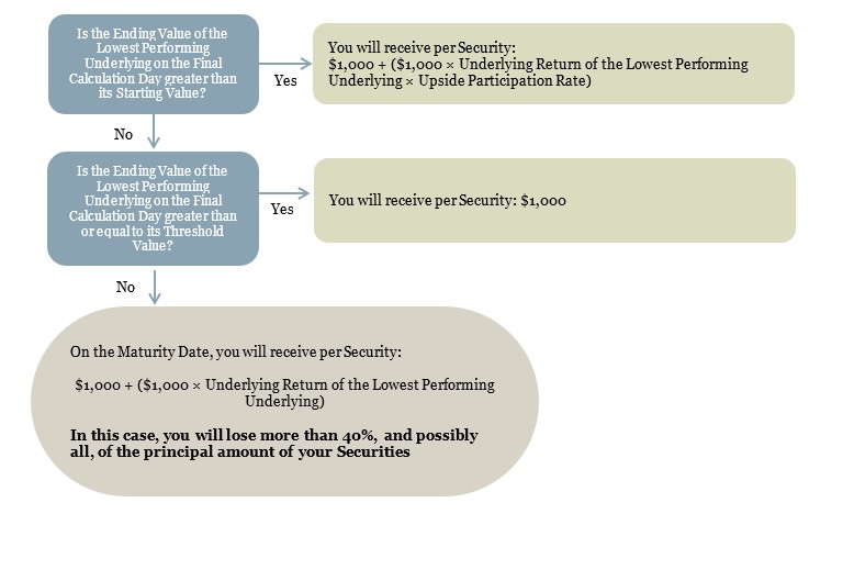 如果 证券不会自动赎回,期末值的表现最低的标的上最终计算日 是小于其门槛值,你将有全下降的下行风险敞口价值的表现最低底层从其起始值,并将失去超过40%,可能还有所有,到期时贵司证券的本金金额。