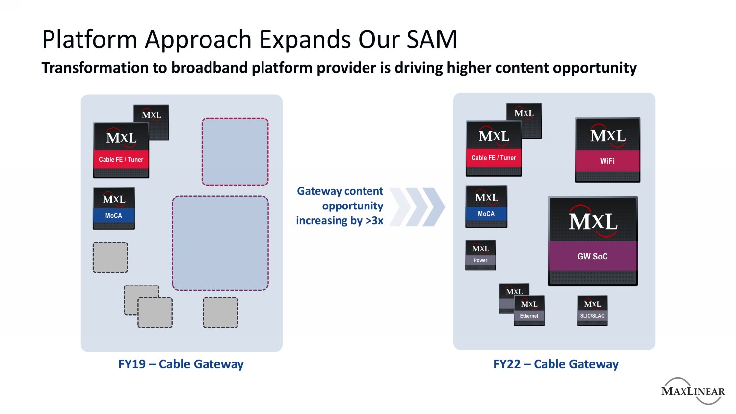 平台方法将我们的SAM转型扩展到宽带平台提供商正在推动更高的内容机会2019财年–电缆网关FY22 –电缆网关电缆FE/调谐器MoCA电缆FE/调谐器MoCA WiFi GW SoC电力以太网SLIC/SLAC网关内容机会增加> 3倍