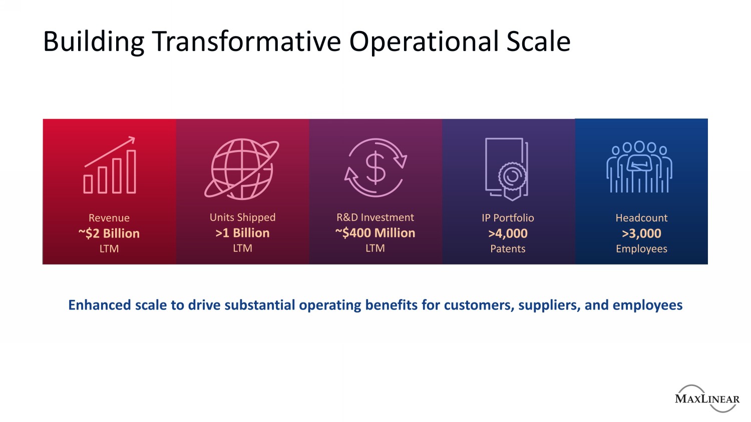 建立变革性的运营规模员工人数> 3,000名员工IP组合> 4,000项专利出货量> 10亿LTM收入~20亿美元LTM研发投资~4亿美元LTM扩大规模,为客户、供应商和员工带来可观的运营收益