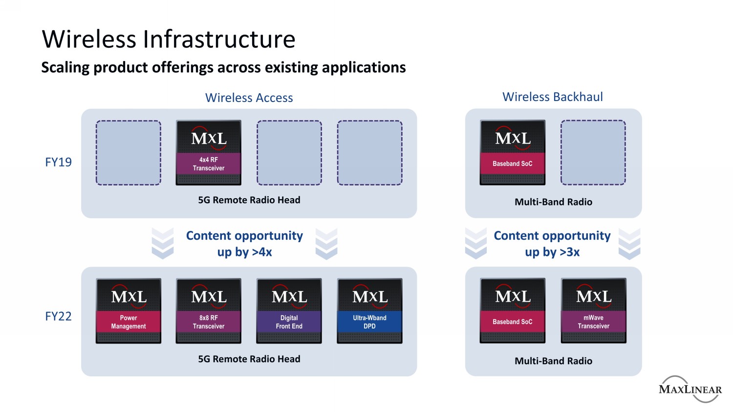 无线基础设施扩展现有应用的产品供应无线接入无线回程FY19 FY22内容机会增加> 4倍内容机会增加> 3倍4x4 RF收发器基带SoC 8x8 RF收发器基带SoC电源管理超WBand DPD数字前端MWave收发器5G远程无线电头5G远程无线电头多波段无线电多波段无线电