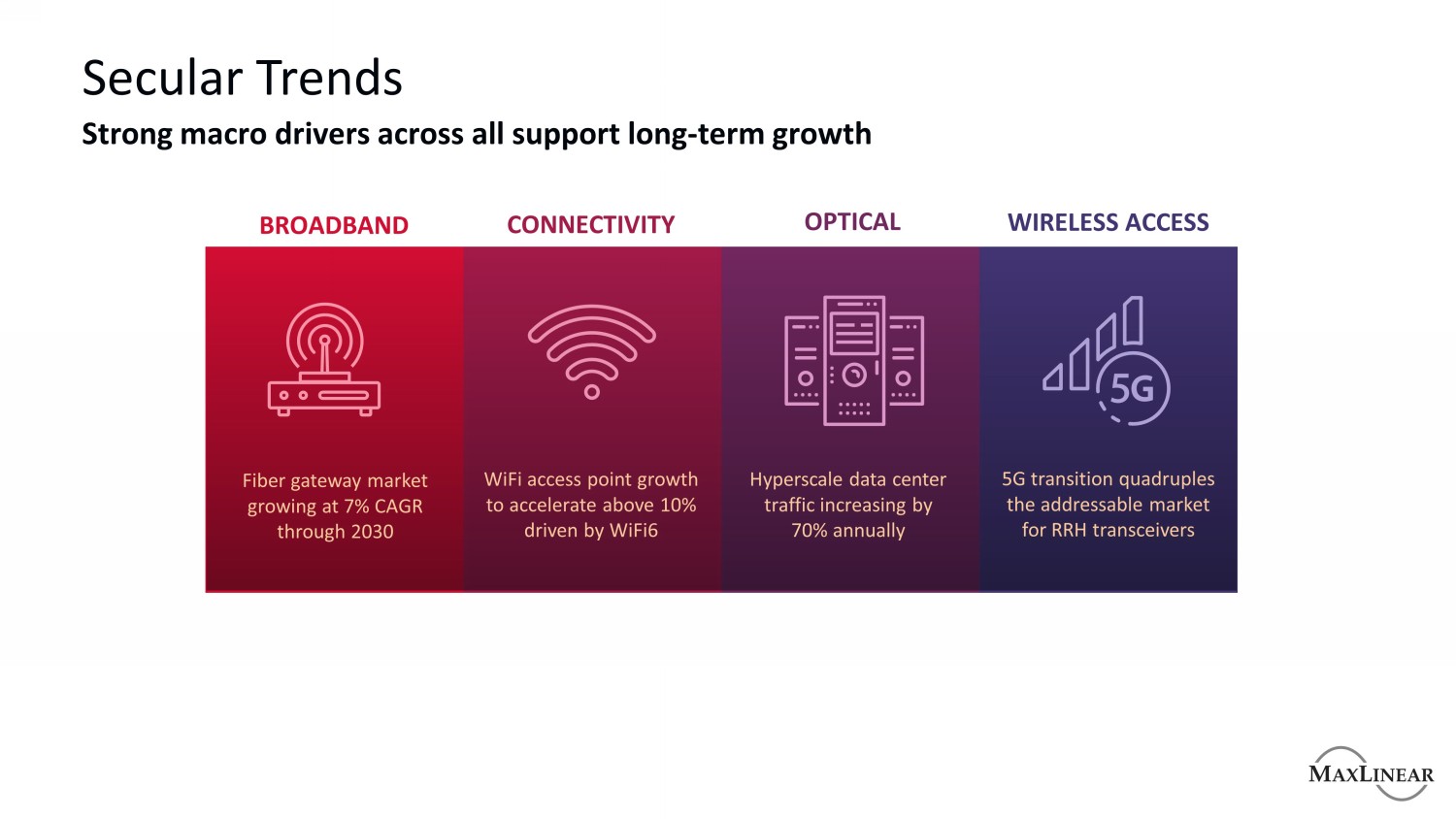 长期趋势强劲的宏观驱动因素支持长期增长宽带连接光无线接入光纤网关市场到2030年以7%的复合年增长率增长WiFi接入点增长将在WiFi6超大规模数据中心流量的推动下加速超过10%每年增长70% 5G过渡可寻址的四倍RRH收发器市场