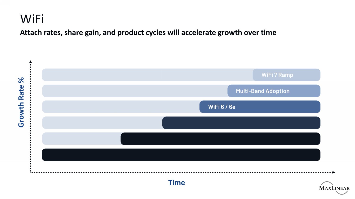 WiFi附加率、份额增长和产品周期将随着时间的推移加速增长增长率%时间WiFi 7斜坡多频段采用WiFi 6/6E