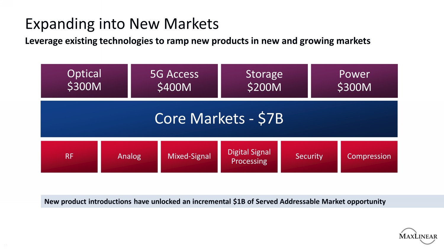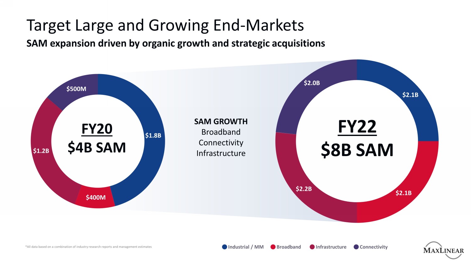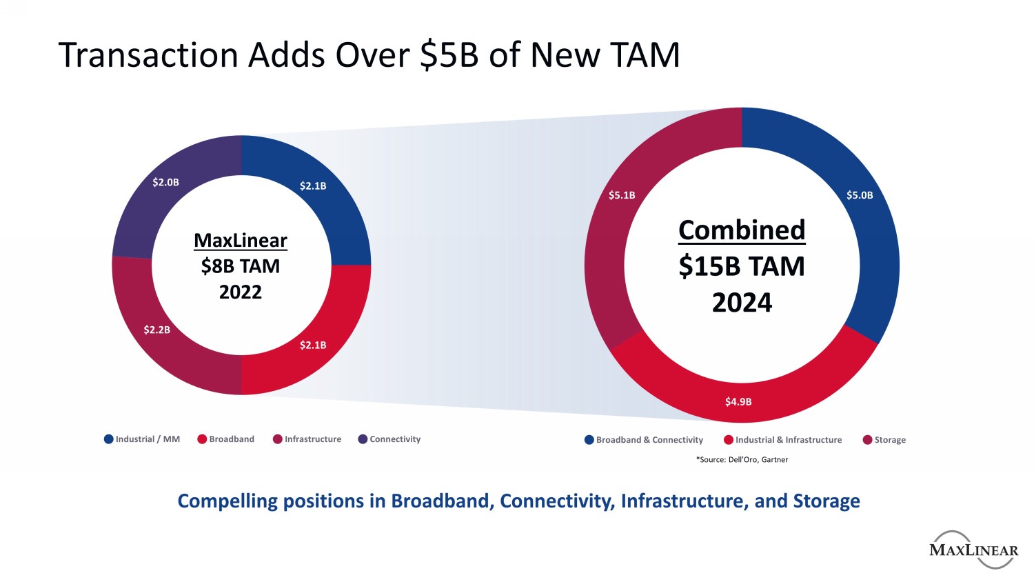 交易增加了超过$ 5B的新TAM MaxLinear $ 8B TAM 2022 $ 2.0B $ 2.1B $ 2.2B $ 2.1B合并$ 15B TAM 2024 $ 5.1B $ 5.0B $ 4.9B工业/MM宽带基础设施连接宽带和连接工业和基础设施存储在宽带、连接、基础设施和存储方面的引人注目的位置*资料来源:Dell'Oro,Gartner