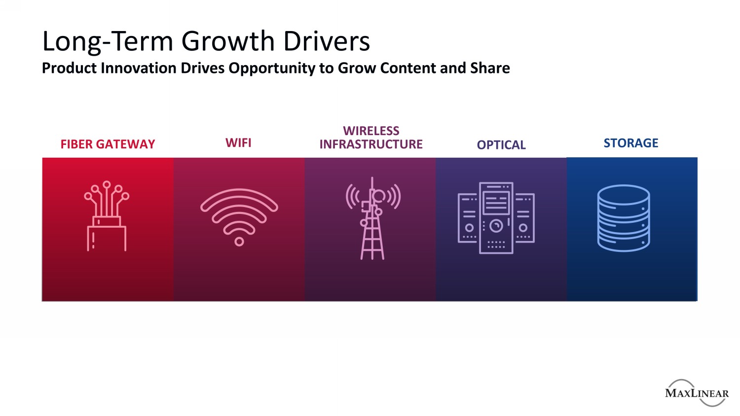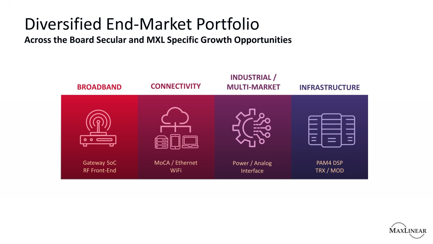 多元化的终端市场产品组合全面长期和MXL特定的增长机会宽带连接工业/多市场基础设施网关SoC射频前端MoCA/以太网WiFi电源/模拟接口PAM4 DSP TRX/MOD