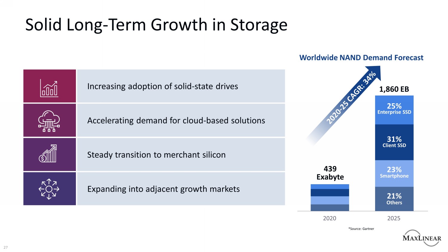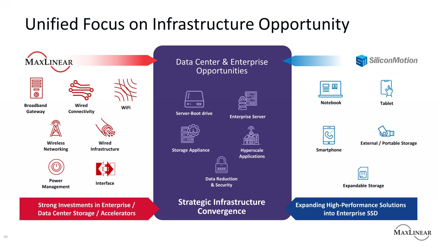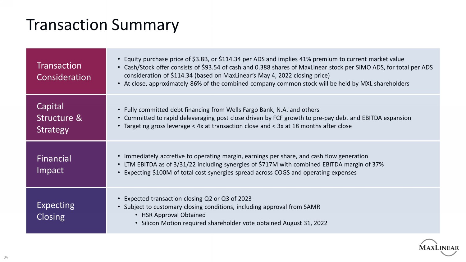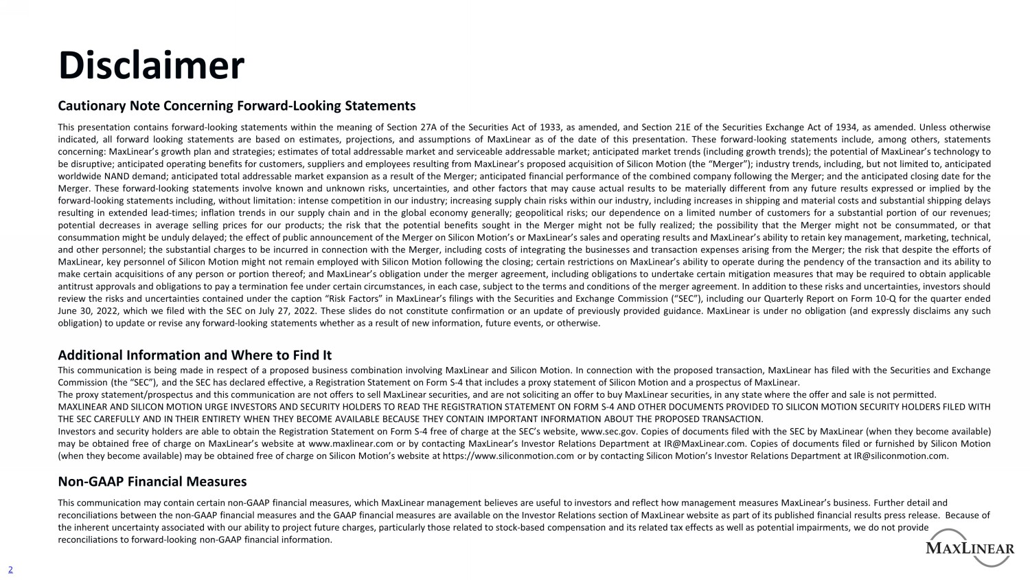 免责声明关于前瞻性陈述的注意事项本演示文稿包含经修订的1933年证券法第27 A节和经修订的1934年证券交易法第21 E节含义内的前瞻性陈述。除非另有说明,所有前瞻性陈述均基于MaxLinear截至本演示文稿日期的估计、预测和假设。这些前瞻性陈述包括,除其他外,关于以下方面的陈述:MaxLinear的增长计划和战略;对总目标市场和可服务目标市场的估计;预期的市场趋势(包括增长趋势);MaxLinear技术具有颠覆性的潜力;为客户带来的预期运营收益,MaxLinear拟收购Silicon Motion(“合并”)而产生的供应商和员工;行业趋势,包括但不限于预期的全球NAND需求;预计的 合并导致的总潜在市场扩张;合并后合并后公司的预期财务表现;以及合并的预期截止日期。这些前瞻性陈述涉及已知和未知的风险、不确定性和其他可能导致实际结果与前瞻性陈述所表达或暗示的任何未来结果存在重大差异的因素,包括,不限于:我们行业的激烈竞争;增加我们行业内的供应链风险,包括运输和材料成本的增加以及导致交货时间延长的大量运输延迟;我们供应链中的通货膨胀趋势以及全球经济;地缘政治风险;我们的大部分收入依赖于数量有限的客户;我们产品的平均售价可能下降;合并中寻求的潜在利益可能不存在的风险 完全实现;合并可能无法完成,或完成可能被过度延迟的可能性;合并公告对Silicon Motion或MaxLinear的销售和经营业绩的影响,以及MaxLinear保留关键管理、营销、技术、和其他人员;与合并相关的大量费用,包括整合业务的成本和合并产生的交易费用;尽管MaxLinear做出了努力,但风险仍然存在,交易完成后,Silicon Motion的关键人员可能不会继续受雇于Silicon Motion;对MaxLinear在交易未决期间的运营能力及其对任何人或其部分进行某些收购的能力的某些限制;和MaxLinear在合并协议下的义务,包括采取某些缓解措施的义务,这些措施可能需要获得适用的反垄断批准 以及在某些情况下支付终止费的义务,在每种情况下,均受合并协议的条款和条件的约束。除了这些风险和不确定性之外,投资者还应审查MaxLinear向美国证券交易委员会(“SEC”)提交的文件中“风险因素”标题下包含的风险和不确定性,包括我们关于本季度10-Q表的季度报告截至2022年6月30日,我们于2022年7月27日向美国证券交易委员会提交了该文件。这些幻灯片不构成对先前提供的指导的确认或更新。MaxLinear没有义务(并明确表示不承担任何此类义务)更新或修改任何前瞻性陈述,无论是由于新信息、未来事件或其他原因。其他信息和在哪里可以找到它本次沟通是针对涉及MaxLinear和Silicon Motion的拟议业务合并进行的。就拟议交易而言, MaxLinear已向美国证券交易委员会(“SEC”)提交了一份S-4表注册声明,其中包括Silicon Motion的代理声明和MaxLinear的招股说明书,SEC已宣布该注册声明生效。委托书/招股说明书和本通讯不是出售MaxLinear证券的要约,也不是在任何不允许要约和出售的州征求购买MaxLinear证券的要约。MaxLinear和Silicon Motion敦促投资者和证券持有人仔细阅读S-4表上的注册声明以及提供给Silicon Motion证券持有人的其他文件,当它们全部可用时,因为它们包含有关拟议交易的重要信息.投资者和证券持有人可以在美国证券交易委员会的网站WWW政府免费获得表格S-4上的注册声明。MaxLinear向SEC提交的文件副本(当它们成为 可用)可在MaxLinear的网站WWW maxlinear. com上免费获取,或通过ir @ maxlinear. com联系MaxLinear的投资者关系部。Silicon Motion提交或提供的文件副本(当它们可用时)可在Silicon Motion的网站https://siliconmotion.com上免费获取,或通过ir@siliconmotion.com联系Silicon Motion的投资者关系部。非GAAP财务指标本通讯可能包含某些非GAAP财务指标,MaxLinear管理层认为这些指标对投资者有用,并反映了管理层如何衡量MaxLinear的业务。MaxLinear网站的投资者关系部分提供了非GAAP财务指标和GAAP财务指标之间的更多详细信息和对账,作为其发布的财务业绩新闻稿的一部分。由于与我们预测未来费用的能力相关的固有不确定性, 特别是那些与基于股票的补偿及其相关税收影响以及潜在减值相关的信息,我们不提供与前瞻性非GAAP财务信息的对账。2