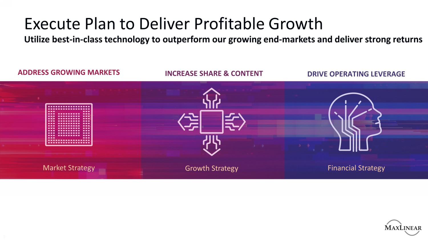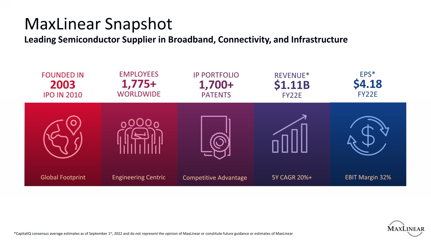 MaxLinear Snapshot宽带、连接、和基础设施成立于2003年2010年首次公开募股员工1,775 +全球知识产权组合1,700 +专利收入* $ 1.11B FY22E EPS * $ 4.18 FY22E全球足迹以工程为中心的竞争优势5Y CAGR 20% + EBIT利润率32% * CapitalIQ共识平均估计截至9月1日,2022年,不代表MaxLinear的意见或构成MaxLinear的未来指导或估计