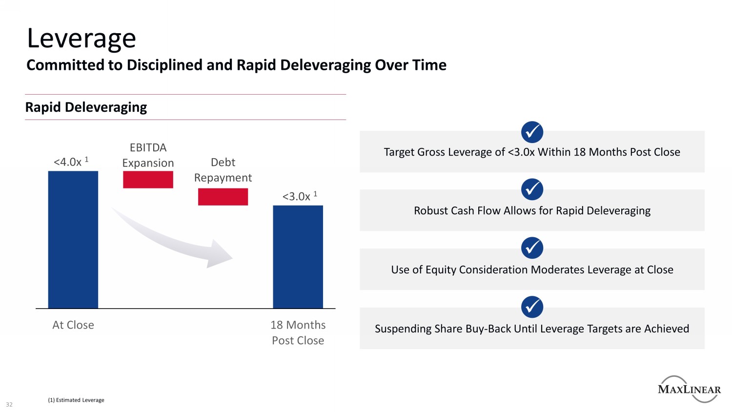 < 4.0x 1 < 3.0x 1 EBITDA扩张在收盘后18个月偿还债务杠杆稳健的现金流允许快速去杠杆化x收盘后18个月内目标总杠杆< 3.0x x x使用股权对价缓和收盘时的杠杆x承诺纪律严明随着时间的推移快速去杠杆化暂停股票回购,直到实现杠杆目标x(1)估计杠杆32