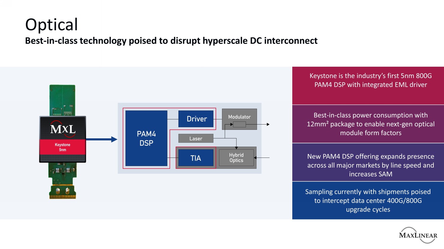 光学一流技术有望颠覆超大规模直流互连Keystone是业界首款集成EML驱动器的5nm 800G PAM4 DSP,具有12毫米²封装的一流功耗,可实现下一代光学模块外形新的PAM4 DSP产品扩展按线路速度在所有主要市场上的存在并增加SAM Keystone 5nm采样目前出货量已准备好拦截数据中心400G/800G升级周期