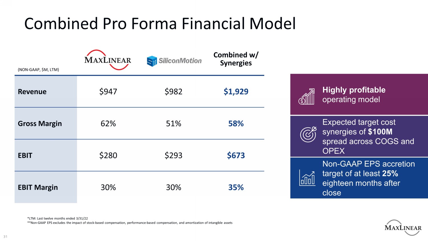 31合并备考财务模型合并与协同效应收入$ 947 $ 982 $ 1,929毛利率62% 51% 58% EBIT $ 280 $ 293 $ 673 EBIT利润率30% 30% 35%高利润运营模式预期目标成本协同效应1亿美元分布在COGS和OPEX非GAAP每股收益增长目标至少为25%收盘后18个月* LTM:截至22年3月31日的最后十二个月* *非GAAP每股收益不包括基于股票的薪酬、基于绩效的薪酬和无形资产的摊销