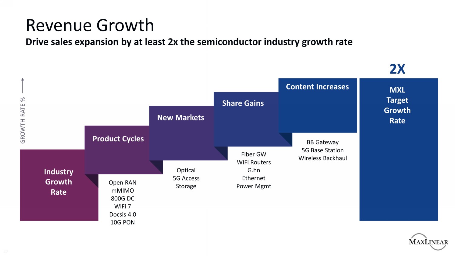 收入增长20推动销售扩张至少2倍半导体行业增长率行业增长率MXL目标增长率产品周期内容增加新市场份额收益光纤GW WiFi路由器G.hn以太网电源MGMT BB网关5G基站无线回程光5G接入存储开放RAN MMIMO 800G DC WiFi 7 DOCSIS 4.0 10G PON 2X增长率%