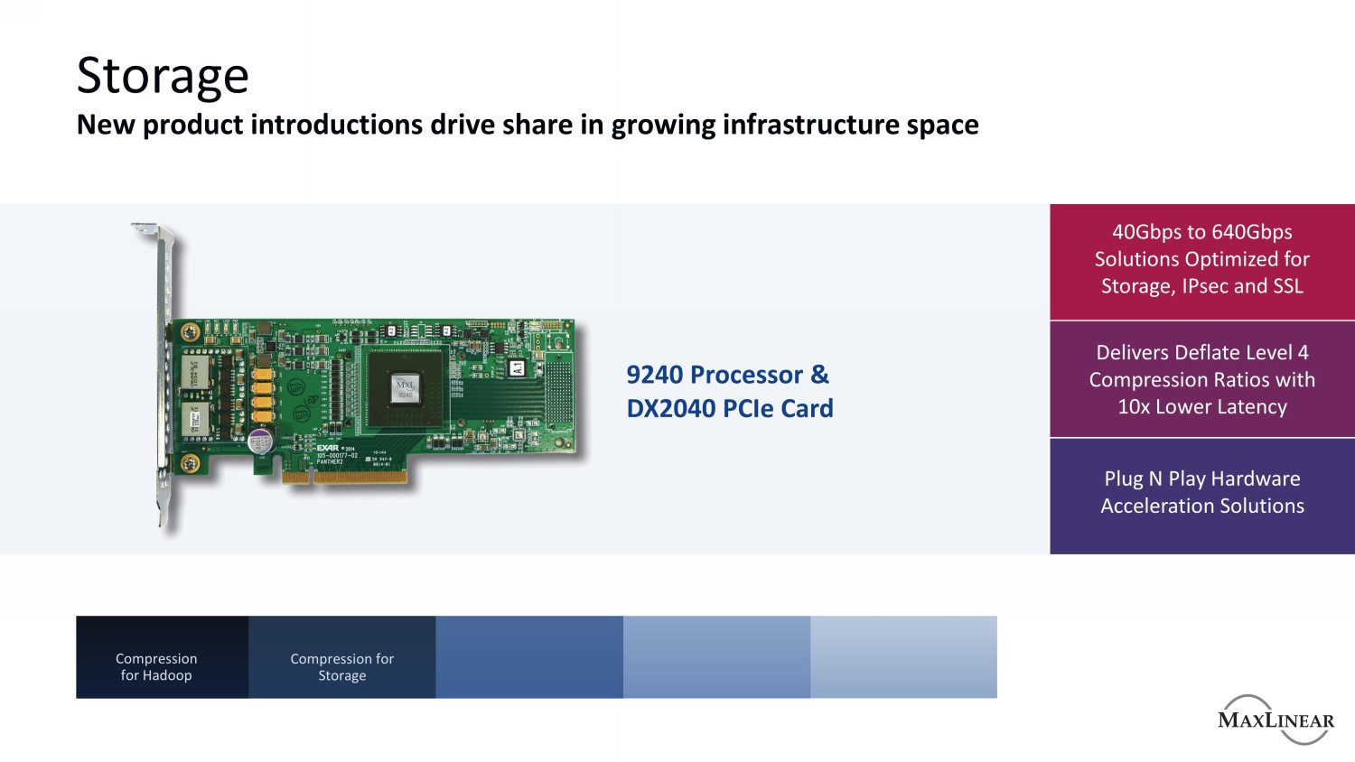 存储新产品的推出推动了在不断增长的基础设施空间中的份额用于存储的Hadoop压缩40Gbps至640Gbps针对存储、IPSec和SSL进行了优化的解决方案提供具有10倍更低延迟的Deflate Level 4压缩率即插即用硬件加速解决方案9240处理器和DX2040 PCIe卡