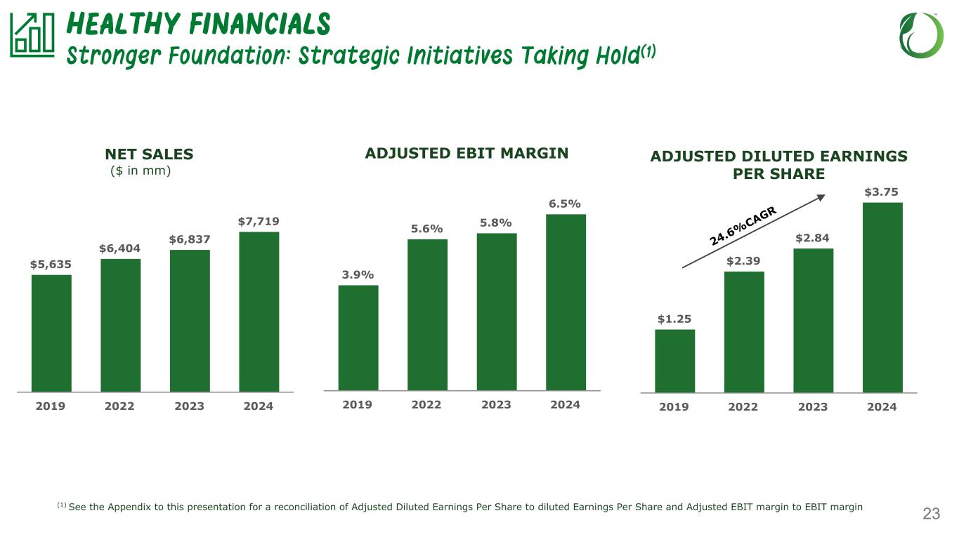 (1)有关调整后稀释每股收益与稀释每股收益和调整后息税前利润率与息税前利润率的对账,请参见本演示文稿的附录23净销售额(mm美元)调整后稀释后每股收益调整后息税前利润率更稳固的基础:战略举措站稳脚跟(1)$ 5,635 $ 6,404 $ 6,837 $ 7,719201920222023202320243.9% 5.6% 5.8% 6.5% 2019202220232024 $ 1.25 $ 2.39 $ 2.84 $ 3.75 201920222023202424.6% CAGR