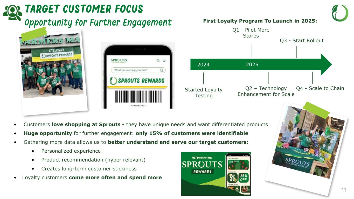 •客户喜欢在Sprouts购物——他们有独特的需求,想要差异化的产品•进一步参与的巨大机会:只有15%的客户是可识别的•收集更多的数据使我们能够更好地了解和服务目标客户:•个性化体验•产品推荐(高度相关)•创造长期客户粘性•忠诚客户更经常来并花费更多2024年开始忠诚度测试Q1-试点更多商店Q2 –技术增强促进规模Q3-开始推出Q4-规模到链第一忠诚度计划将于2025年推出:2025年11目标客户焦点机会进一步参与