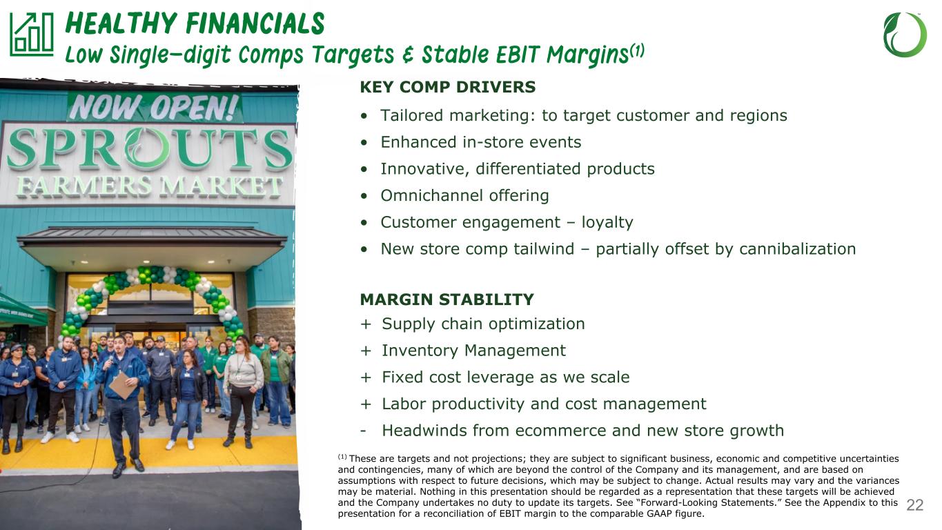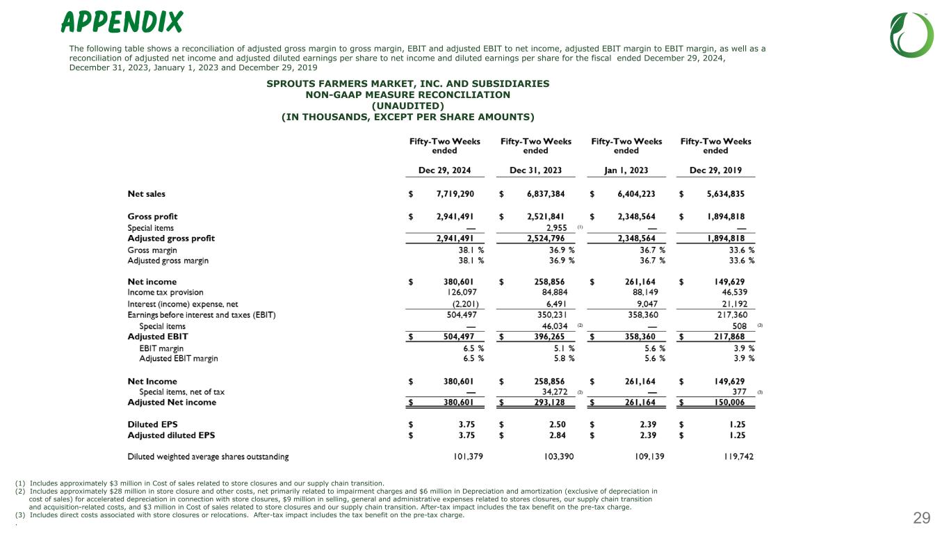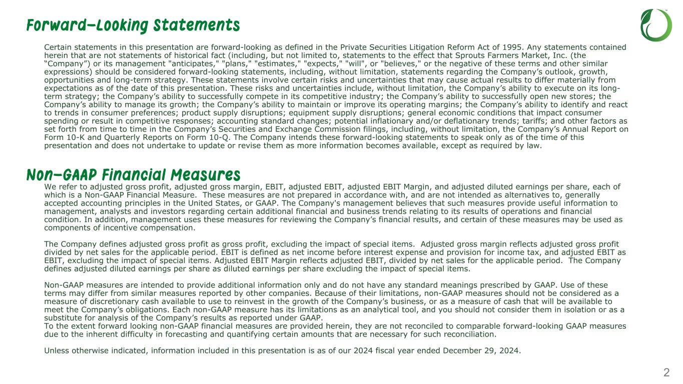 前瞻性陈述本演示文稿中的某些陈述具有1995年《私人证券诉讼改革法案》中定义的前瞻性。此处包含的任何非历史事实陈述(包括但不限于大意为Sprouts Farmers Market, Inc.(“公司”)或其管理层“预期”、“计划”、“估计”、“预期”、“将”或“相信”或这些术语的否定以及其他类似表达的陈述)均应被视为前瞻性陈述,包括但不限于关于公司前景、增长、机会和长期战略的陈述。这些陈述涉及某些风险和不确定性,可能导致实际结果与截至本演示文稿发布之日的预期存在重大差异。这些风险和不确定性包括但不限于,公司执行其长期战略的能力;公司在其竞争激烈的行业中成功竞争的能力;公司成功开设新店的能力;公司管理其增长的能力;公司维持或提高其营业利润率的能力;公司识别和应对消费者偏好趋势的能力;产品供应中断;设备供应中断;一般经济状况影响消费者支出或导致竞争性反应;会计准则变更;潜在的通货膨胀和/或通货紧缩趋势;关税;以及公司向美国证券交易委员会提交的文件中不时列出的其他因素,包括但不限于公司关于表格10-K的年度报告和表格10-Q的季度报告。公司打算这些前瞻性陈述仅在本演示文稿发布时发表,并且不承诺在获得更多信息后对其进行更新或修订,除非法律要求。我们参考调整后的毛利、调整后的毛利率、息税前利润、调整后的息税前利润、调整后的息税前利润率和调整后的稀释每股收益,每一项都是非公认会计准则财务指标。这些措施不是根据美国公认会计原则或公认会计原则编制的,也不是作为替代措施。公司管理层认为,这些措施为管理层、分析师和投资者提供了有关与其经营业绩和财务状况相关的某些额外财务和业务趋势的有用信息。此外,管理层将这些措施用于审查公司的财务业绩,其中某些措施可能被用作激励薪酬的组成部分。公司将调整后毛利定义为毛利,不包括特殊项目的影响。调整后的毛利率反映调整后的毛利润除以适用期间的净销售额。EBIT定义为扣除利息支出和所得税拨备前的净收入,调整后EBIT为EBIT,不包括特殊项目的影响。调整后息税前利润率反映调整后息税前利润除以适用期间的净销售额。公司将调整后的稀释每股收益定义为不包括特殊项目影响的稀释每股收益。非GAAP措施仅旨在提供额外信息,没有GAAP规定的任何标准含义。使用这些术语可能与其他公司报告的类似措施不同。由于其局限性,非GAAP衡量标准不应被视为可用于对公司业务增长进行再投资的可自由支配现金的衡量标准,也不应被视为可用于履行公司义务的现金的衡量标准。每一种非GAAP衡量标准作为一种分析工具都有其局限性,您不应孤立地考虑它们,也不应将其作为根据GAAP报告的公司业绩分析的替代品。就本文提供的前瞻性非GAAP财务指标而言,由于在预测和量化此类对账所需的某些金额方面存在固有困难,因此它们与可比的前瞻性GAAP指标不一致。除非另有说明,本演示文稿中包含的信息截至我们截至2024年12月29日的2024财年。非公认会计原则财务措施2