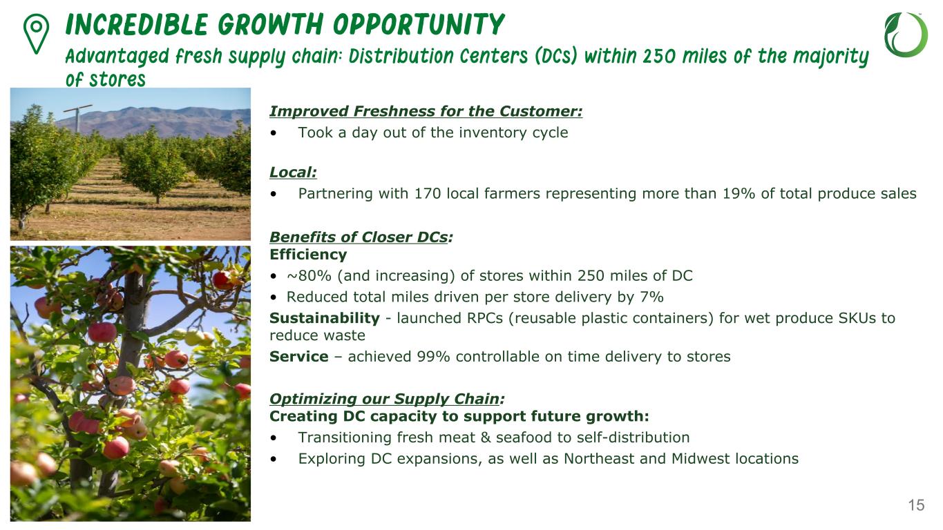 提高了客户的新鲜度:•在库存周期中花了一天时间当地:•与170名当地农民合作,占更接近的DC总产品销售的19%以上的好处:效率• DC 250英里范围内的商店约80%(并且还在增加)•将每个商店交付的总行驶里程减少7%可持续性-推出的RPC(可重复使用的塑料容器)为湿产SKU减少浪费服务–实现99%可控准时交付门店优化我们的供应链:创造DC产能以支持未来增长:•将鲜肉和海鲜转变为自配送•探索DC扩张,以及东北和中西部地区15个令人难以置信的增长机会优势生鲜供应链:大多数门店250英里范围内的配送中心(DC)