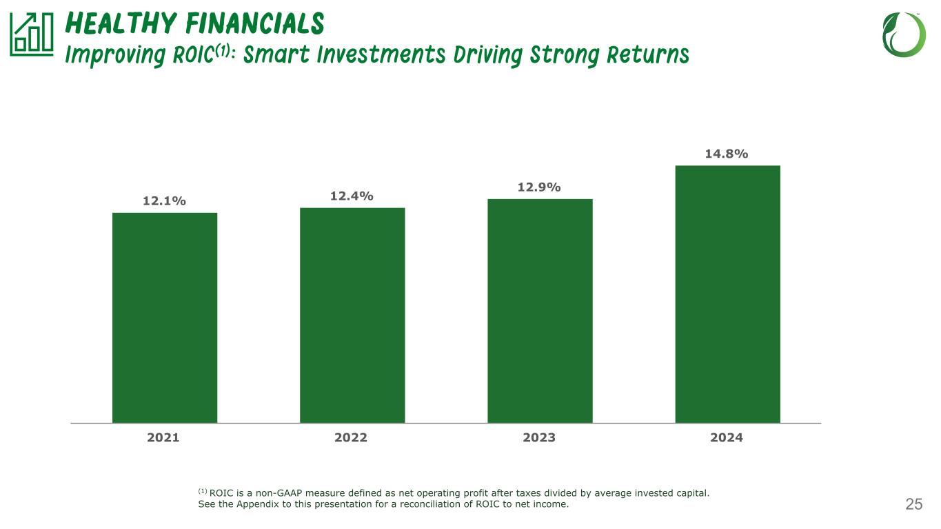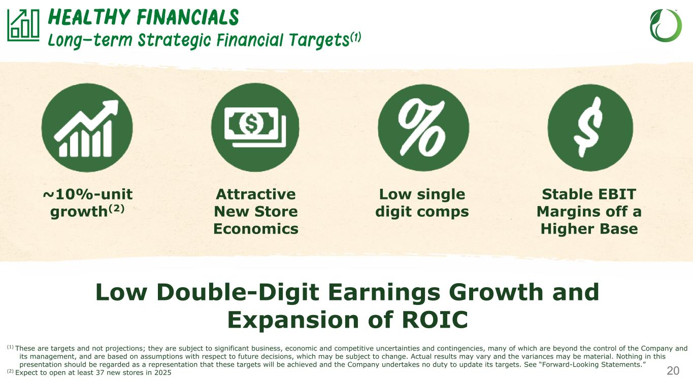 有吸引力的新店经济性~10%-单位增长(2)低个位数在较高基数下带来稳定的息税前利润率低两位数的盈利增长和ROIC的扩大(1)这些只是目标而不是预测;它们受到重大业务、经济和竞争不确定性和或有事项的影响,其中许多超出了公司及其管理层的控制范围,并且是基于对未来决策的假设,这些假设可能会发生变化。实际结果可能各不相同,差异可能很大。本演示文稿中的任何内容均不应被视为表示这些目标将会实现,并且公司不承担更新其目标的义务。见“前瞻性陈述”。(2)预计2025年至少新开37家门店20健康金融长期战略财务目标(1)