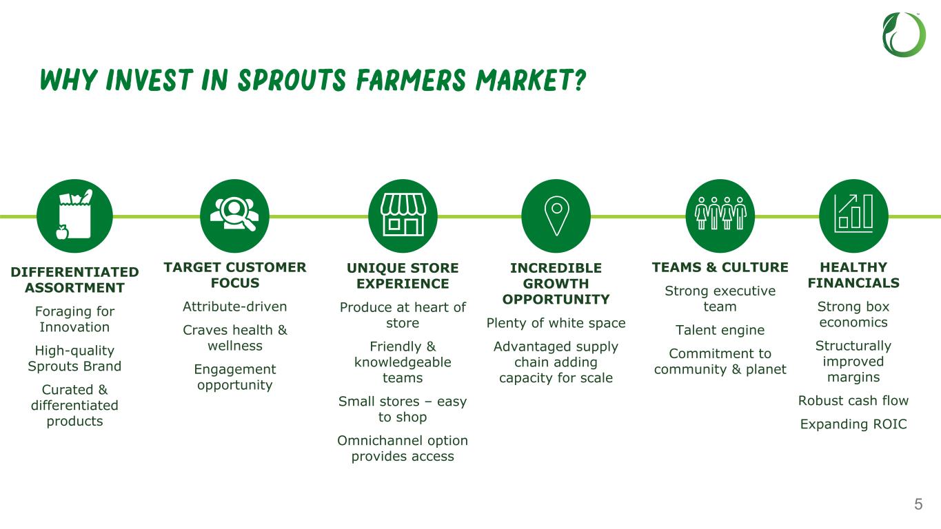 为什么要投资SPROUTS农民市场?差异化分类觅食创新高品质新芽品牌策划&差异化产品团队&文化强大的执行团队人才引擎承诺社区&星球令人难以置信的增长机会大量留白优势供应链为规模目标客户添加能力焦点属性驱动渴望健康&健康参与机会健康金融强劲的盒子经济学结构性改善利润率稳健的现金流扩大了ROIC独特的商店经验产生于商店的核心友好和知识渊博的团队小型商店–易于购物的全渠道选项提供访问5