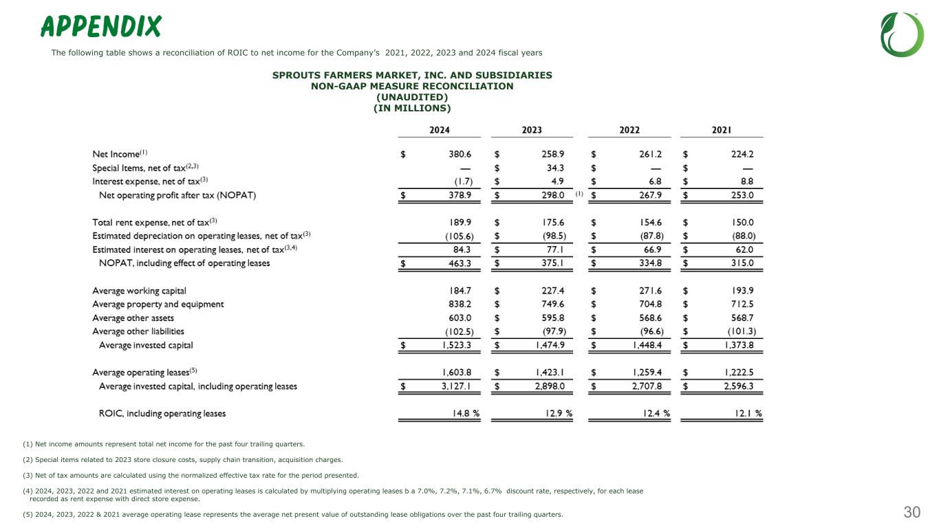 附录下表显示了公司2021、2022、2023和2024财年SPROUTS FARMERS Market,INC.的ROIC与净收入的对账情况。和子公司非公认会计准则计量对账(未经审计)(百万)(1)净收入金额代表过去四个季度的净收入总额。(2)与2023年关店成本、供应链过渡、收购费用相关的特殊项目。(3)税后净额采用呈列期间的标准化有效税率计算。(4)2024年度、2023年度、2022年度及2021年度经营租赁的估计利息,按经营租赁b分别乘以7.0%、7.2%、7.1%、6.7%的贴现率计算,每项租赁记作租金费用与直接店铺费用。(5)2024、2023、2022和2021年平均经营租赁是指过去四个季度未偿租赁债务的平均净现值。30
