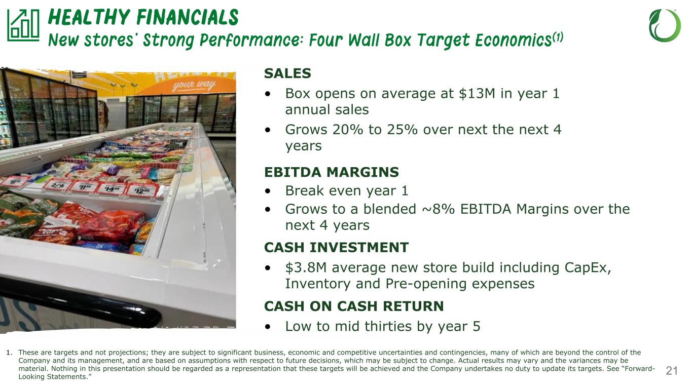 EBITDA利润率•第1年盈亏平衡•未来4年增长至混合约8%的EBITDA利润率现金投资•平均380万美元的新店建设,包括资本支出、库存和开业前费用1。这些是目标而不是预测;它们受到重大业务、经济和竞争不确定性和意外事件的影响,其中许多超出了公司及其管理层的控制范围,并且基于对未来决策的假设,可能会发生变化。实际结果可能各不相同,差异可能很大。本演示文稿中的任何内容均不应被视为表示这些目标将会实现,并且公司不承担更新其目标的义务。见“前瞻性陈述”。销售• Box在第1年开店的平均年销售额为1300万美元•未来4年增长20%至25%现金回报率•到第5年低至30多岁21 HEATHY FINANCIALS新店的强劲表现:四个Wall Box目标经济学(1)