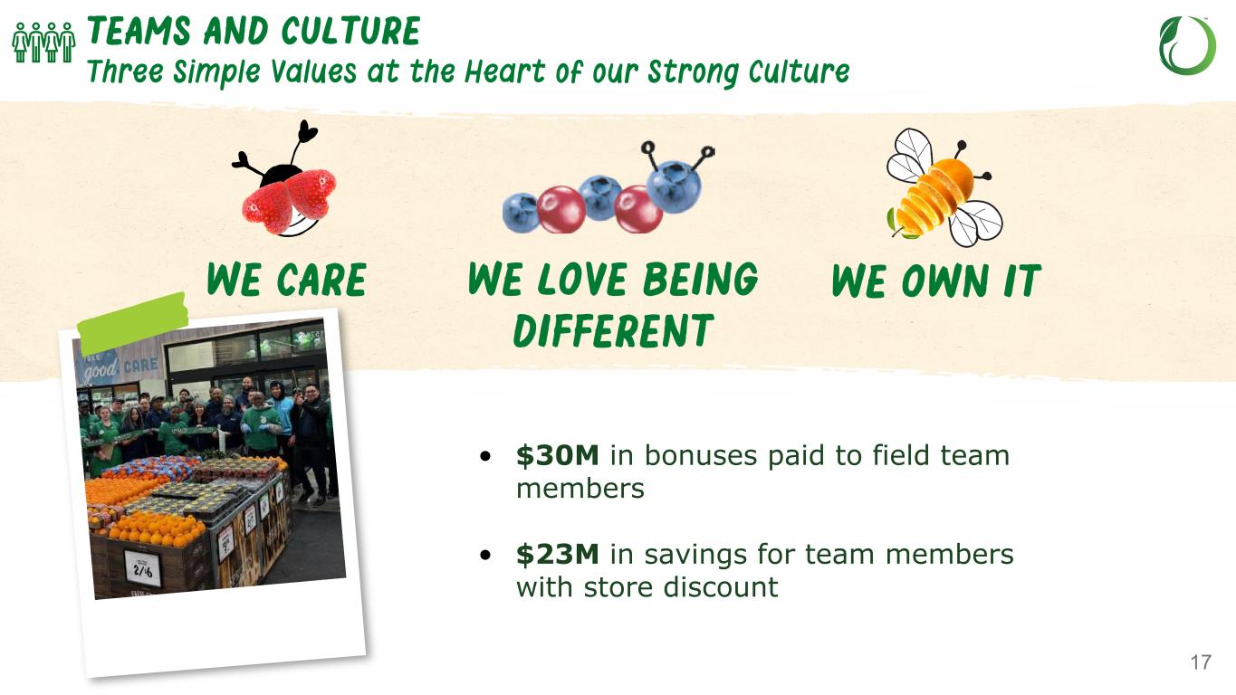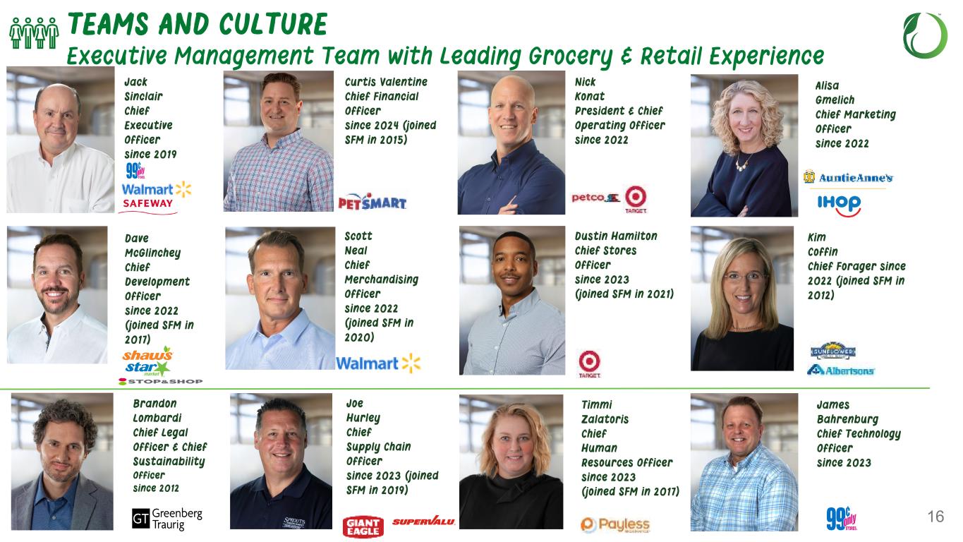 16个团队和文化执行管理团队,拥有领先的杂货和零售经验Jack Sinclair自2019年起担任首席执行官Curtis Valentine自2024年起担任首席财务官(2015年加入SFM)Scott Neal自2022年起担任首席营销官(2020年加入SFM)Dustin Hamilton自2023年起担任首席商店官(2021年加入SFM)Dave McGlinchey自2022年起担任首席开发官(2017年加入SFM)Brandon Lombardi自2012年起担任首席法务官兼首席可持续发展官Kim Coffin自2022年起担任首席Forager(2012年加入SFM)Joe Hurley首席供应链官自2023年起(2019年加入SFM)James Bahrenburg首席技术官自2023年起Timmi Zalatoris首席人力资源官自2023年起(2017年加入SFM)Nick Konat总裁兼首席运营官自2022年起Alisa Gmelich首席营销官自2022年起