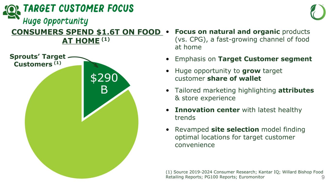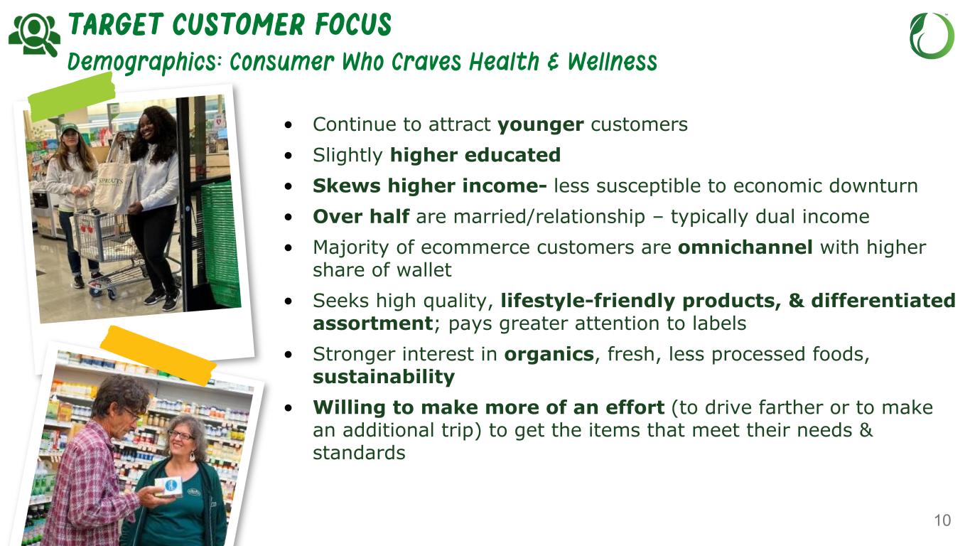 9 •专注于天然和有机产品(vs. CPG),家庭食品的快速增长渠道•强调目标客户群•巨大的机会增加钱包的目标客户份额•量身定制的营销突出属性和门店体验•具有最新健康趋势的创新中心•改进的选址模型为目标客户寻找最佳位置便利消费者在家中花费1.6T美元购买食品(1)Sprouts的目标客户(1)(1)来源2019-2024年消费者研究;Kantar IQ;Willard Bishop食品零售报告;PG100报告;Euromonitor 290美元B目标客户关注巨大机会
