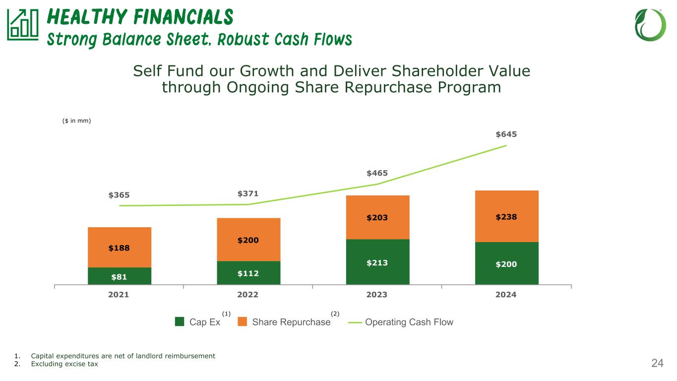 通过正在进行的股票回购计划1,为我们的增长和交付股东价值提供自我资金。资本支出是扣除房东报销后的净额2。不包括消费税24健康金融公司强劲的资产负债表,稳健的现金流$ 81 $ 112 $ 213 $ 200 $ 188 $ 200 $ 203 $ 238 $ 365 $ 371 $ 465 $ 645资本支出股票回购经营现金流2021202220232024($ in mm)(1)(2)