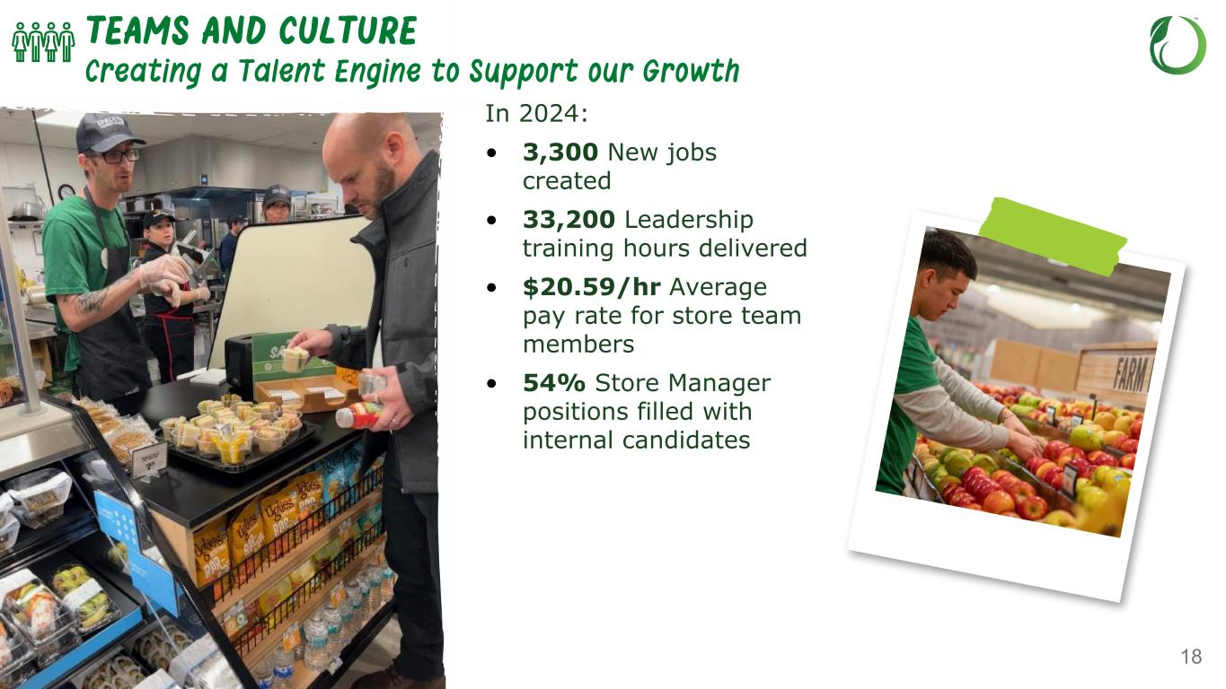2024年:•新增3300个工作岗位•交付33200个领导能力培训小时•门店团队成员平均工资为20.59美元/小时• 54%的门店经理职位由内部候选人填补18个团队和文化创建人才引擎以支持我们的增长