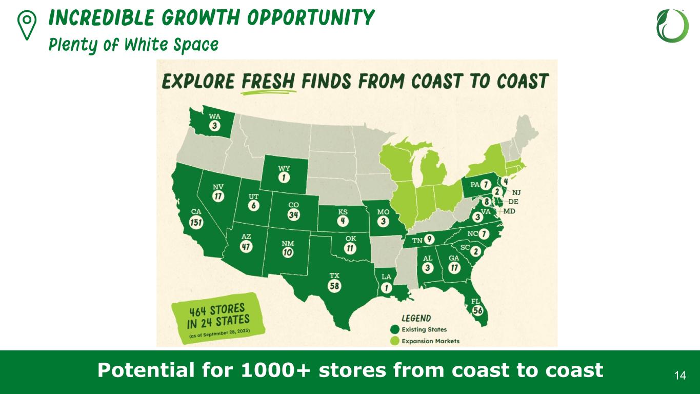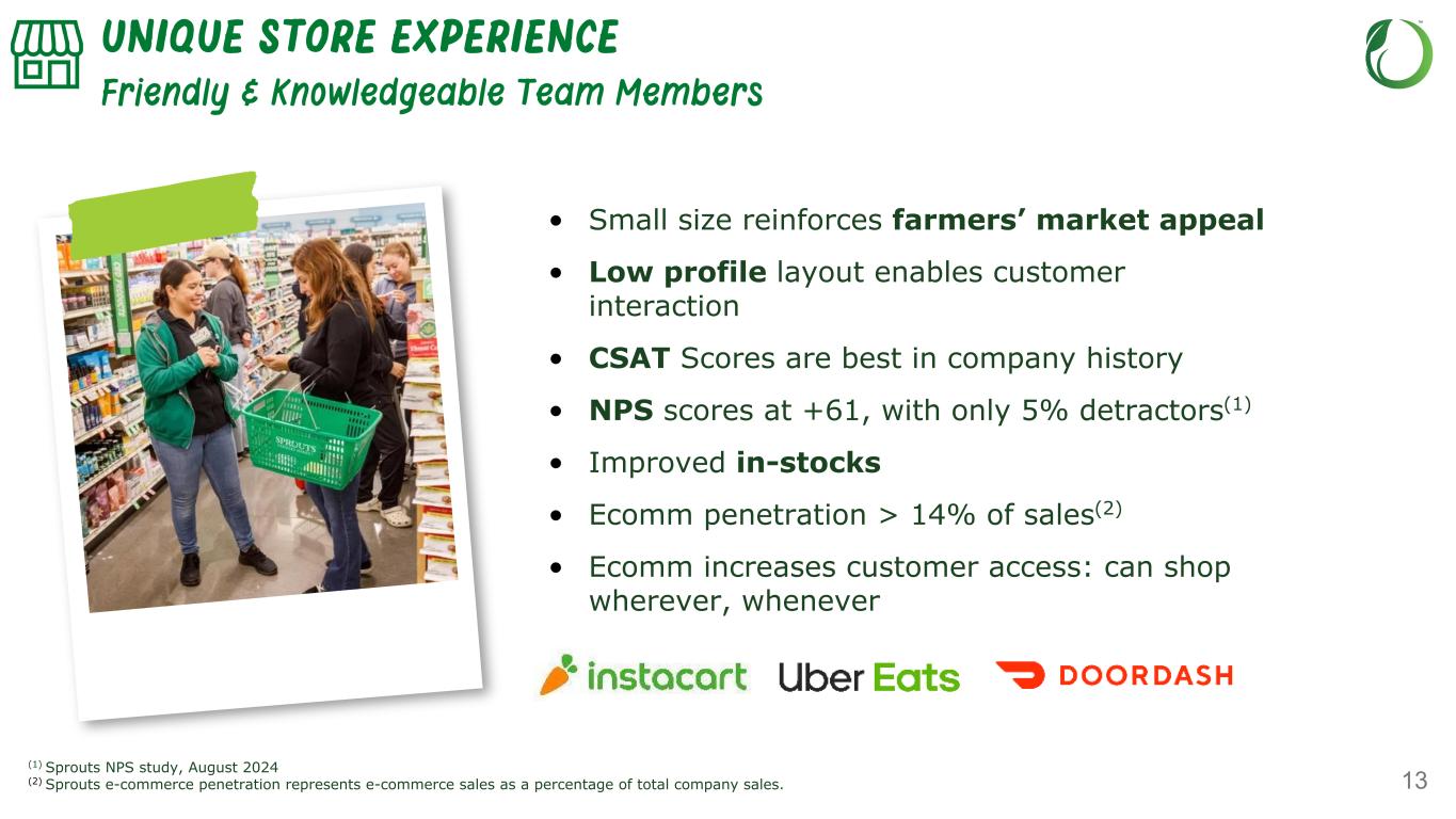 •小尺寸增强农民的市场吸引力•低调布局使客户互动成为可能• CSAT得分为公司历史最佳• NPS得分为+ 61,仅有5%的诋毁者(1)•改进的库存• Ecomm渗透率>销售额的14%(2)• Ecomm增加客户准入:可以在任何地方购物,无论何时(1)Sprouts NPS研究,2024年8月(2)Sprouts电子商务渗透率代表电子商务销售额占公司总销售额的百分比。13位UniQue Store Experience友好且知识渊博的团队成员