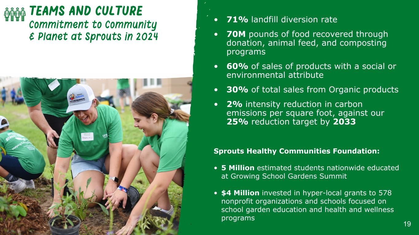 • 71%的垃圾填埋场分流率•通过捐赠、动物饲料和堆肥计划回收了7000万磅的食物•具有社会或环境属性的产品销售额的60% •有机产品总销售额的30% •每平方英尺碳排放强度降低2%,根据我们到2033年削减25%的目标,Sprouts Healthy Communities Foundation:•全国范围内估计有500万学生在Growing School Gardens Summit接受教育•向578个专注于学校花园教育和健康和保健计划的非营利组织和学校投资400万美元,用于超本地赠款19个团队和文化承诺在2024年在Sprouts开展社区和星球