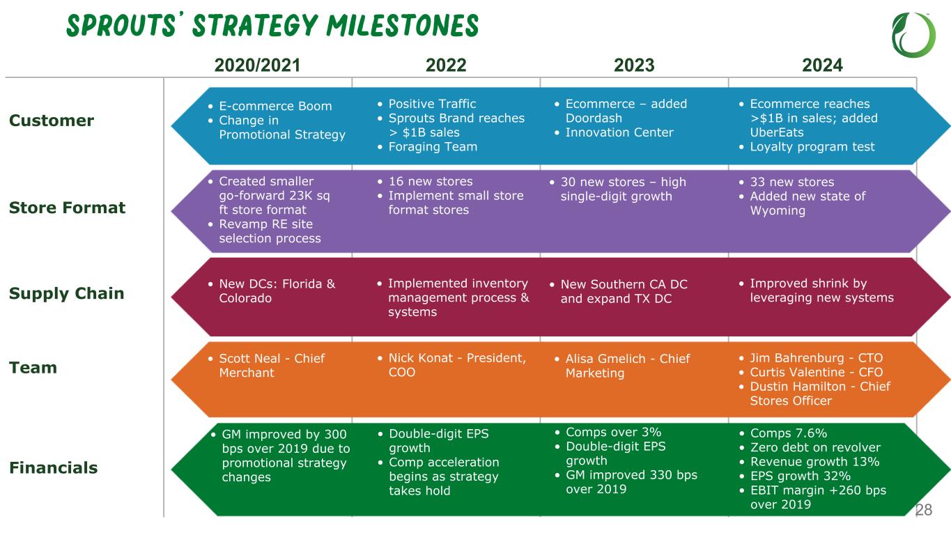 SPROUTS的战略里程碑2020/2021202220232024客户门店业态供应链团队财务•电子商务繁荣•促销策略改变•正流量• Sprouts品牌达到> $ 1B销售额•觅食团队•电子商务–增加Doordash •创新中心•电子商务达到> $ 1B销售额;增加UberEats •忠诚度计划测试•创建更小的前进2.3万平方英尺的门店业态•改造RE选址流程• 16家新门店•实施小型门店业态门店• 30家新门店–高个位数增长• 33家新门店•新增怀俄明州新• ScottNeal-首席商人• Nick Konat-总裁,首席运营官• Alisa Gmelich-首席营销官• Jim Bahrenburg-CTO • Curtis Valentine-首席财务官• Dustin Hamilton-首席销售官•新的配送中心:佛罗里达州和科罗拉多州•实施库存管理流程和系统•通过利用新系统改善收缩•由于促销策略的变化,通用汽车比2019年提高了300个基点•每股收益实现两位数增长• Comp加速开始随着战略站稳脚跟• COMPs超过3% •每股收益实现两位数增长•通用汽车比2019年提高330个基点• COMPs 7.6% •左轮手枪零债务•收入增长13% •每股收益增长32% •息税前利润率比2019年+ 260个基点•新增南方加利福尼亚州 DC并扩大TX DC 28