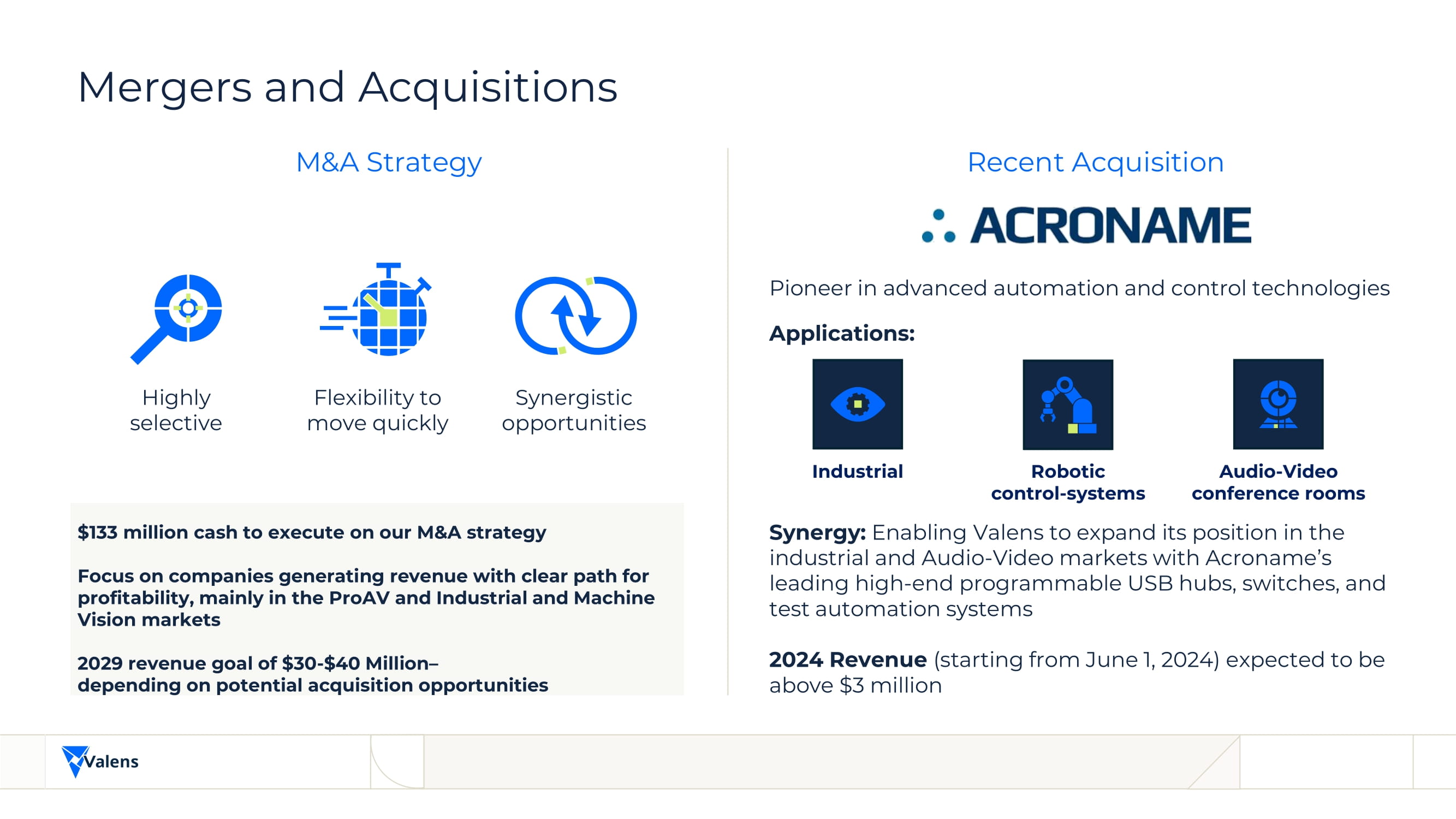 近期先进自动化和控制技术应用领域的收购先锋:并购战略1.33亿美元现金用于执行我们的并购战略专注于产生收入且盈利路径清晰的公司,主要是在ProAV和工业及机器视觉市场2029年收入目标为30-4000万美元–取决于潜在的收购机会并购协同效应:使Valens能够凭借Acroname领先的高端可编程USB集线器、交换机和测试自动化系统扩大其在工业和音频-视频市场的地位2024年收入(从6月1日开始,2024年)预计在300万美元以上工业机器人控制-系统音频-视频会议室快速移动的灵活性高选择性协同机会