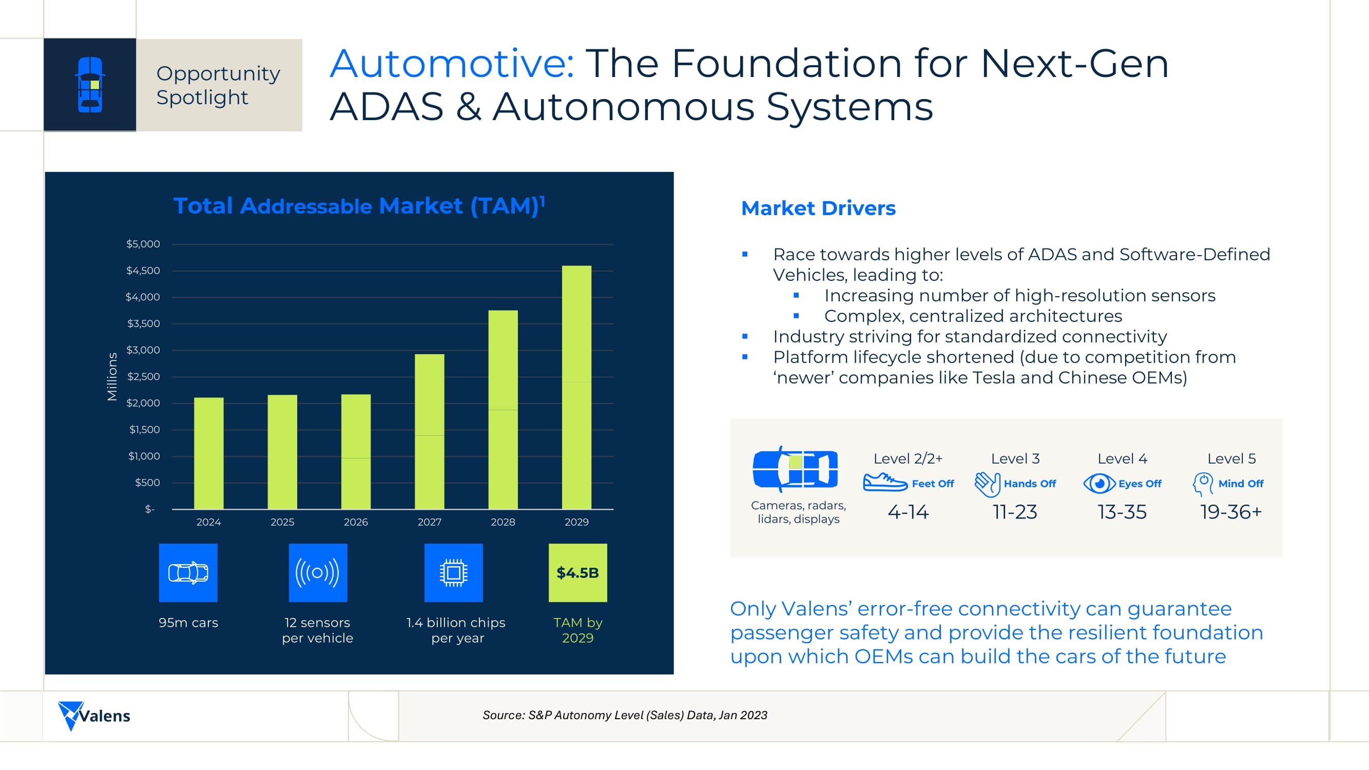 市场驱动因素▪向更高水平的ADAS和软件定义车辆赛跑,导致:▪越来越多的高分辨率传感器▪复杂的集中式架构▪行业争创标准化联通▪平台生命周期缩短(由于来自特斯拉等‘较新’公司和中国主机厂的竞争)汽车:下一代ADAS和自主系统的基础摄像头、雷达、激光雷达、显示器Level 2/2 + Feet Off 4-14 Level 3 Hands Off 11-23 Level 4 Eyes Off 13-35 Level 5 Mind Off 19-36 +来源:标普 Autonomy Level(sales)数据,2023年1月只有Valens的无错误连接才能保障乘客安全,并提供弹性基础,主机厂可以在此基础上制造未来的汽车Total a dressable market(TAM)114亿芯片每年TAM到2029年95m汽车每辆车12个传感器$ 4.5B $-$ 500 $ 1,000 $ 2,000 $ 1,500 $ 2,500 $ 3,500 $ 3,500 $ 3,500 $ 3,500 $ 4,500 $ 4,500 $ 5,000202420252026202720282029百万机会聚焦