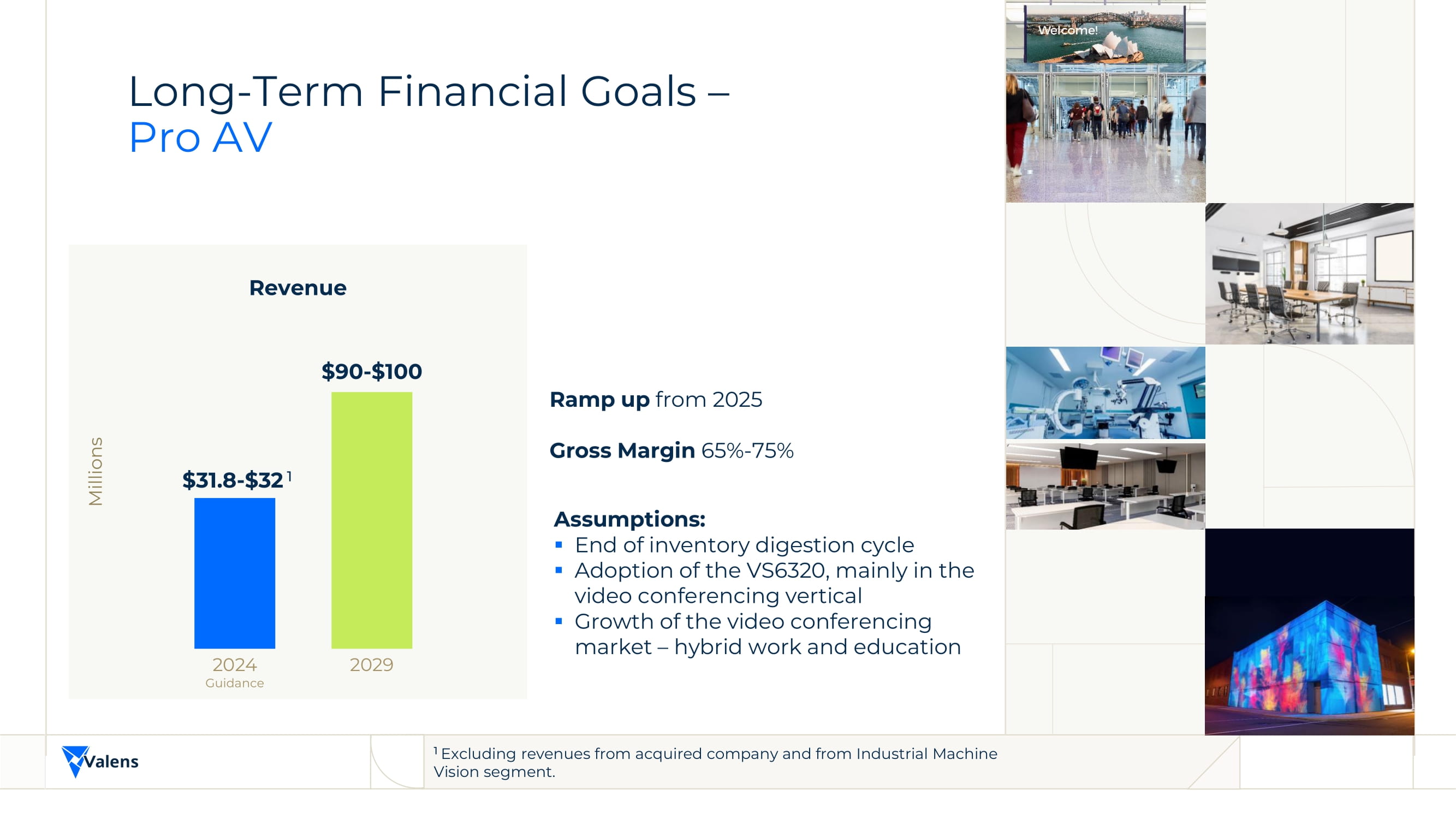 长期财务目标– Pro AV 2024 Guidance 2029 revenue $ 90-$ 100 ramp up from 2025 gross margin 65%-75% $ 31.8-$ 321 assumptions:▪库存消化周期结束▪采用VS6320,主要在视频会议垂直▪视频会议市场的增长–混合工作和教育百万1不包括来自收购公司和工业机器视觉部门的收入。