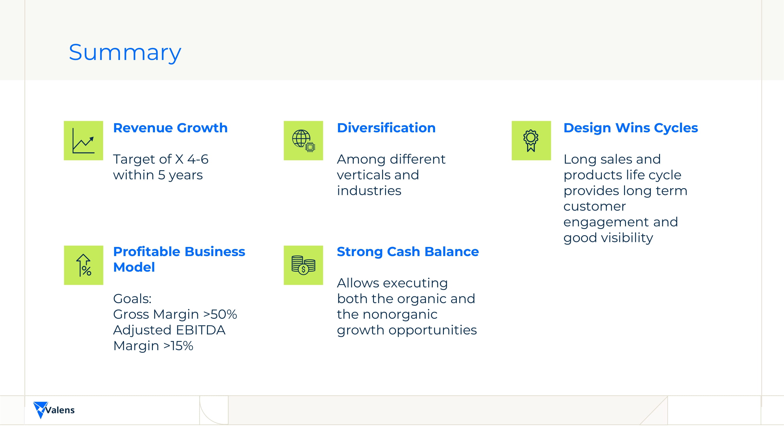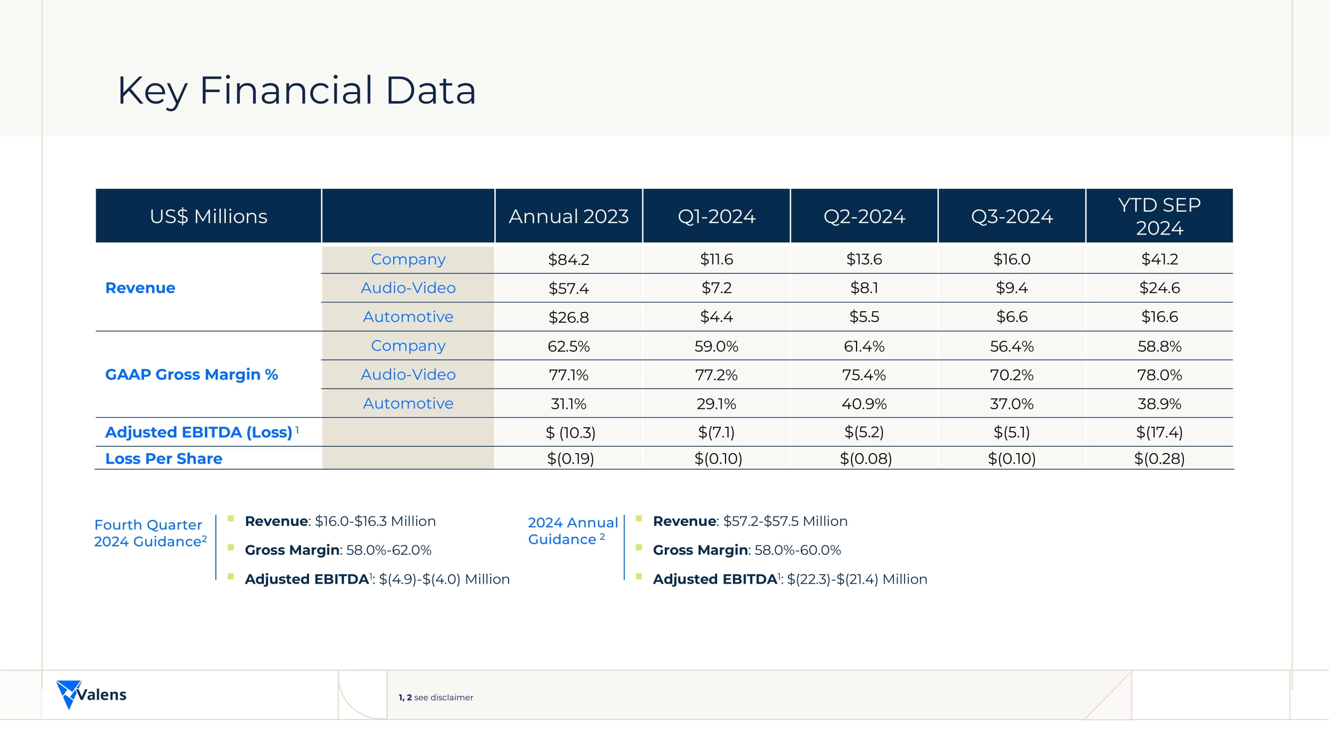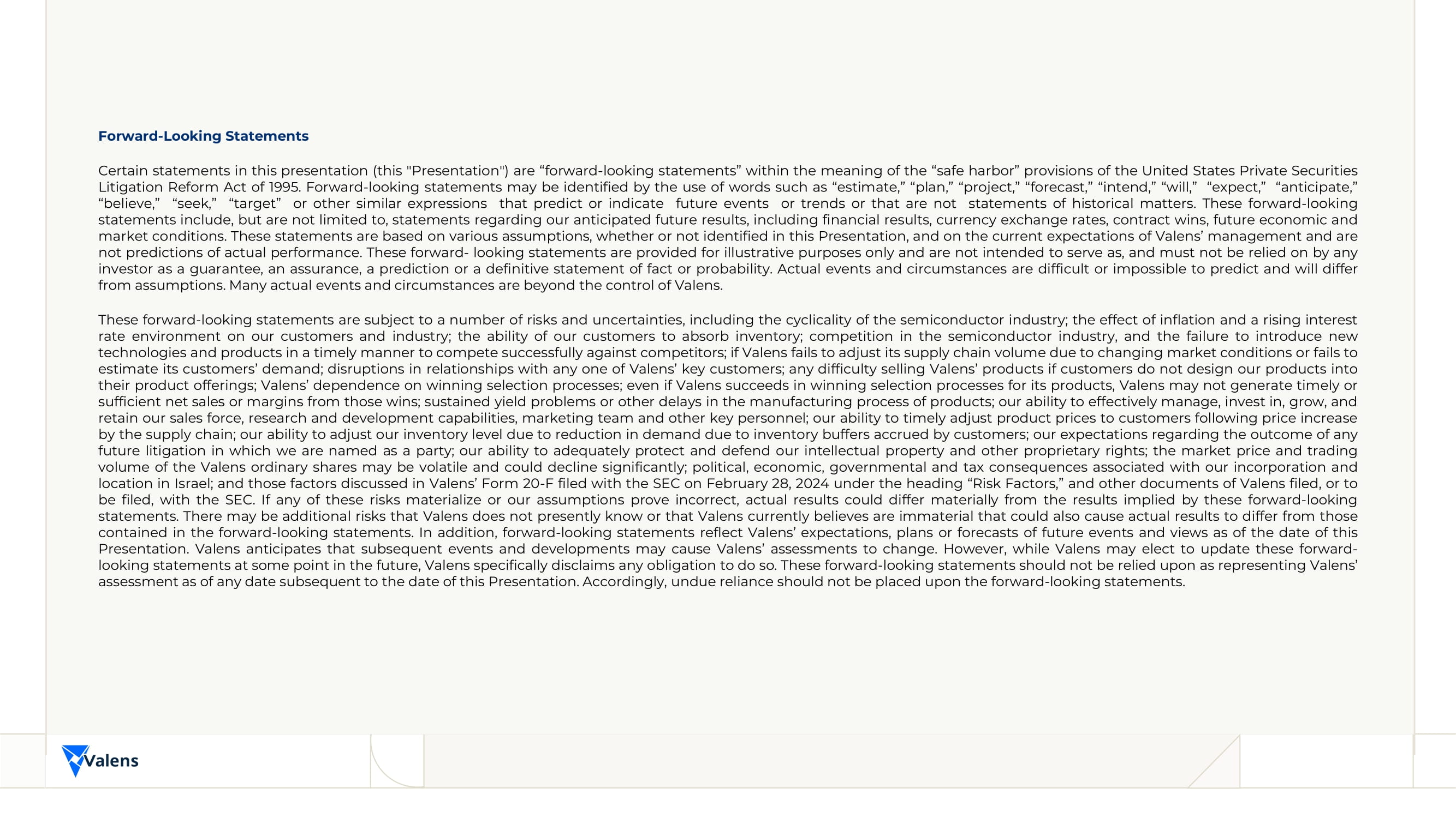 前瞻性陈述本演示文稿(本“演示文稿”)中的某些陈述属于1995年《美国私人证券诉讼改革法案》“安全港”条款含义内的“前瞻性陈述”。前瞻性陈述可以通过使用诸如“估计”、“计划”、“项目”、“预测”、“打算”、“将”、“预期”、“预期”、“相信”、“寻求”、“目标”或其他预测或指示未来事件或趋势或不是历史事件陈述的类似表达方式来识别。这些前瞻性陈述包括但不限于关于我们预期未来业绩的陈述,包括财务业绩、货币汇率、赢得合同、未来经济和市场状况。这些陈述是基于各种假设,无论是否在本演示文稿中确定,以及Valens管理层目前的预期,而不是对实际业绩的预测。这些前瞻性陈述仅用于说明目的,并非旨在作为,也不得被任何投资者作为保证、保证、预测或对事实或可能性的确定陈述所依赖。实际事件和情况很难或不可能预测,将与假设不同。许多实际事件和情况都是瓦伦斯无法控制的。这些前瞻性陈述受到许多风险和不确定性的影响,包括半导体行业的周期性;通货膨胀和利率上升环境对我们的客户和行业的影响;我们的客户吸收库存的能力;半导体行业的竞争,以及未能及时引入新技术和产品以成功与竞争对手竞争;如果Valens因市场条件变化而未能调整其供应链数量或未能估计其客户的需求;与Valens的任何一个关键客户的关系中断;如果客户没有将我们的产品设计到他们的产品供应中,则销售Valens的产品有任何困难;Valens对赢得选择过程的依赖;即使Valens成功地为其产品赢得选择过程,Valens可能无法从这些胜利中产生及时或足够的净销售额或利润率;产品制造过程中的持续良率问题或其他延迟;我们有效管理、投资、发展和保留我们的销售队伍、研发能力的能力,营销团队和其他关键人员;我们在供应链涨价后及时向客户调整产品价格的能力;由于客户积累的库存缓冲导致需求减少,我们调整库存水平的能力;我们对我们被列为当事方的任何未来诉讼结果的预期;我们充分保护和捍卫我们的知识产权和其他所有权的能力;Valens普通股的市场价格和交易量可能会波动,并可能大幅下降;政治、经济、与我们在以色列的注册和所在地相关的政府和税务后果;以及Valens于2024年2月28日在“风险因素”标题下向SEC提交的20-F表格中讨论的那些因素,以及Valens向SEC提交或将提交的其他文件。如果这些风险中的任何一个成为现实或我们的假设被证明不正确,实际结果可能与这些前瞻性陈述所暗示的结果存在重大差异。可能存在Valens目前不知道或Valens目前认为无关紧要的额外风险,这些风险也可能导致实际结果与前瞻性陈述中包含的结果不同。此外,前瞻性陈述反映了Valens对未来事件的预期、计划或预测以及截至本演示文稿发布之日的观点。瓦伦斯预计,随后发生的事件和事态发展可能会导致瓦伦斯的评估发生变化。然而,尽管瓦伦斯可能会选择在未来某个时候更新这些前瞻性陈述,但瓦伦斯明确表示不承担这样做的任何义务。这些前瞻性陈述不应被视为代表Valens在本介绍日期之后的任何日期的评估。因此,不应过分依赖前瞻性陈述。
