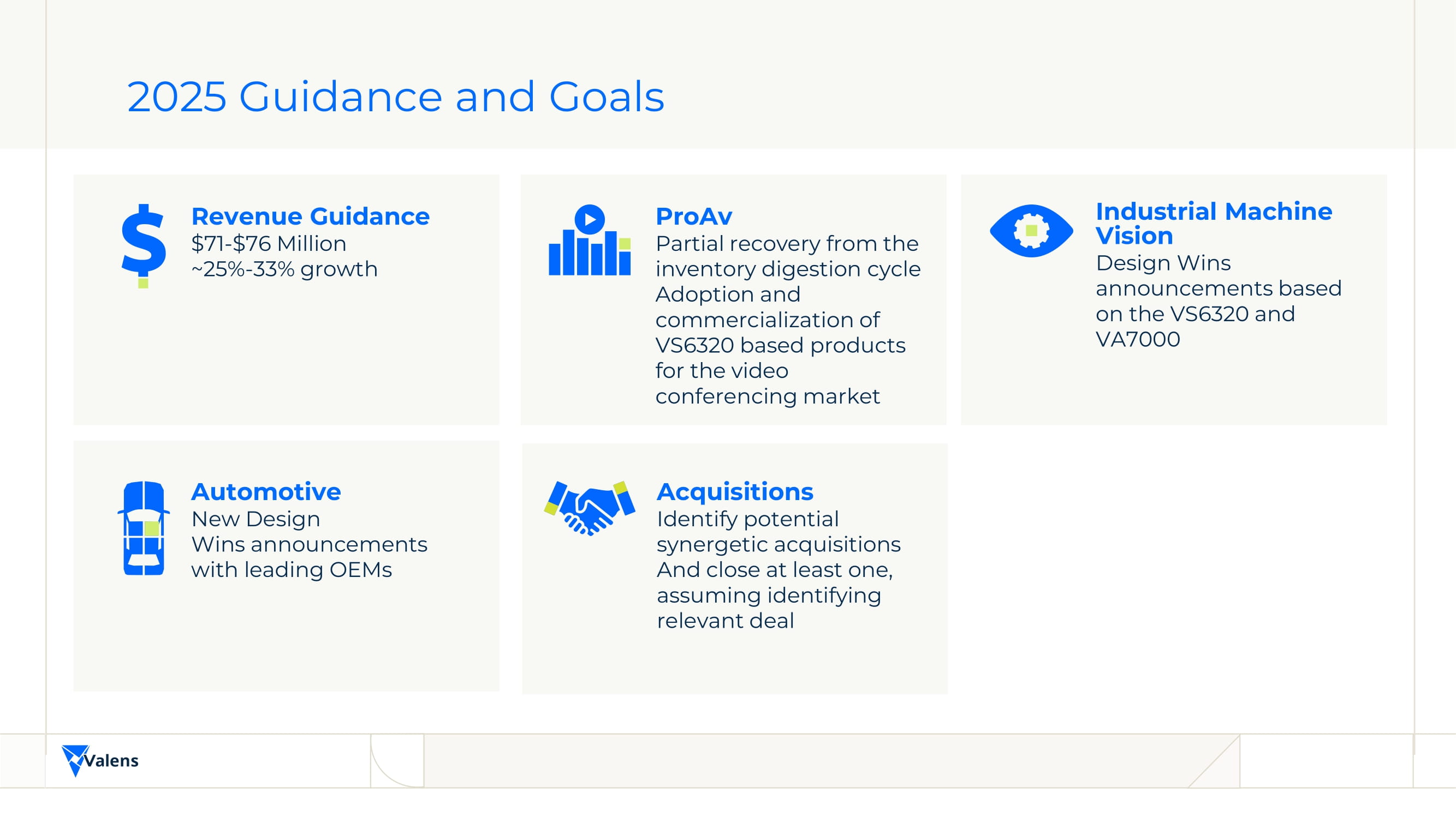 2025年指导和目标收入指导71-7600万美元~25%-33 %增长ProAV从库存消化周期中部分恢复采用和商业化基于VS6320的产品用于视频会议市场工业机器视觉设计赢得基于VS6320和VA7000的公告Automotive New Design赢得与领先OEM收购的公告确定潜在的协同收购并完成至少一项,假设确定相关交易