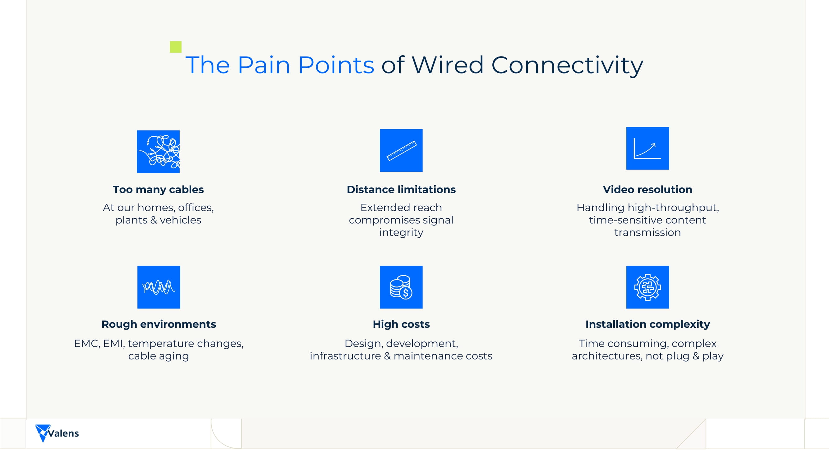 粗糙环境EMC、EMI、温度变化、电缆老化距离限制延伸范围损害信号完整性高成本设计、开发、基础设施和维护成本太多电缆在我们的家庭、办公室、工厂和车辆安装复杂性耗时、架构复杂、不是即插即用视频分辨率处理高吞吐量、时间敏感的内容传输有线连接的痛点