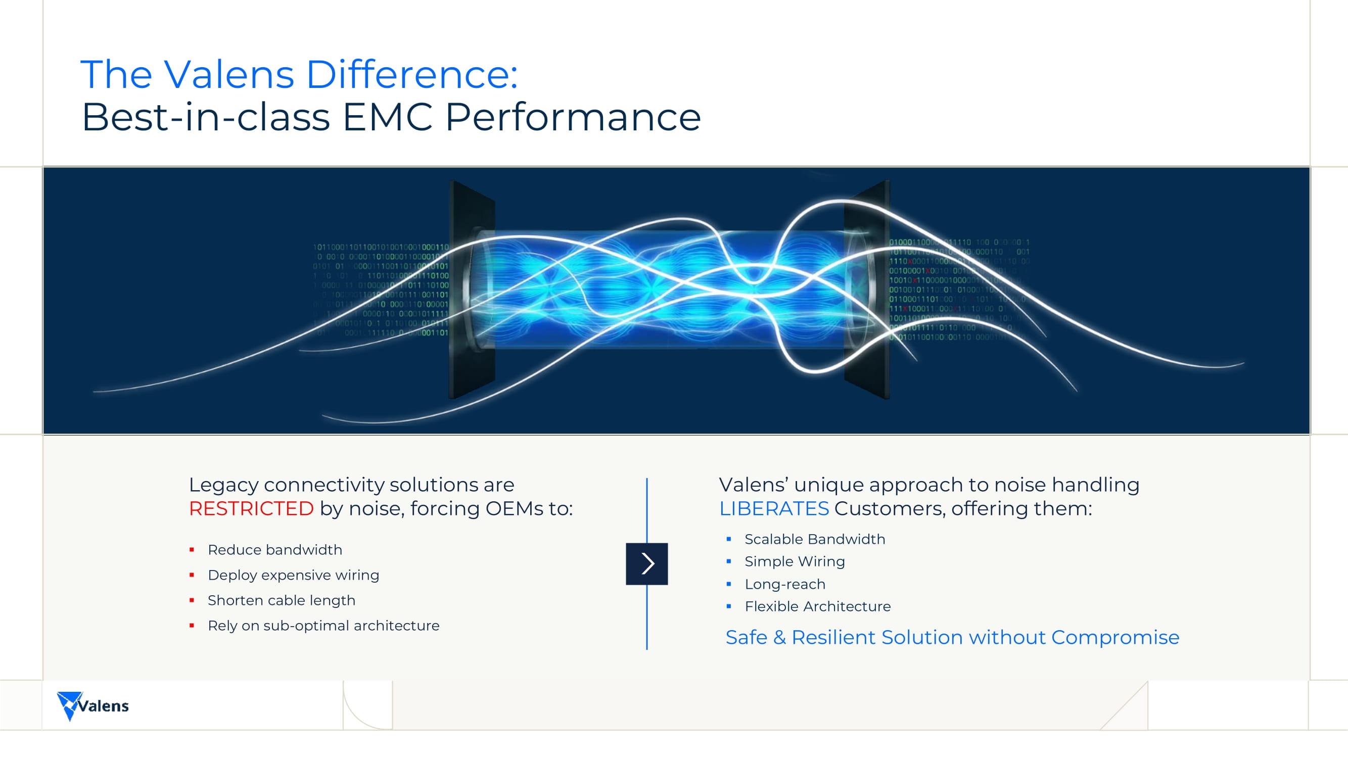 The Valens差异:一流的EMC性能传统连接解决方案受到噪音限制,迫使原始设备制造商:▪降低带宽▪部署昂贵的布线▪缩短电缆长度▪依赖次优架构Valens独特的噪声处理方法解放了客户,为他们提供:▪可伸缩带宽▪简单布线▪长达▪不妥协的灵活架构安全和弹性解决方案
