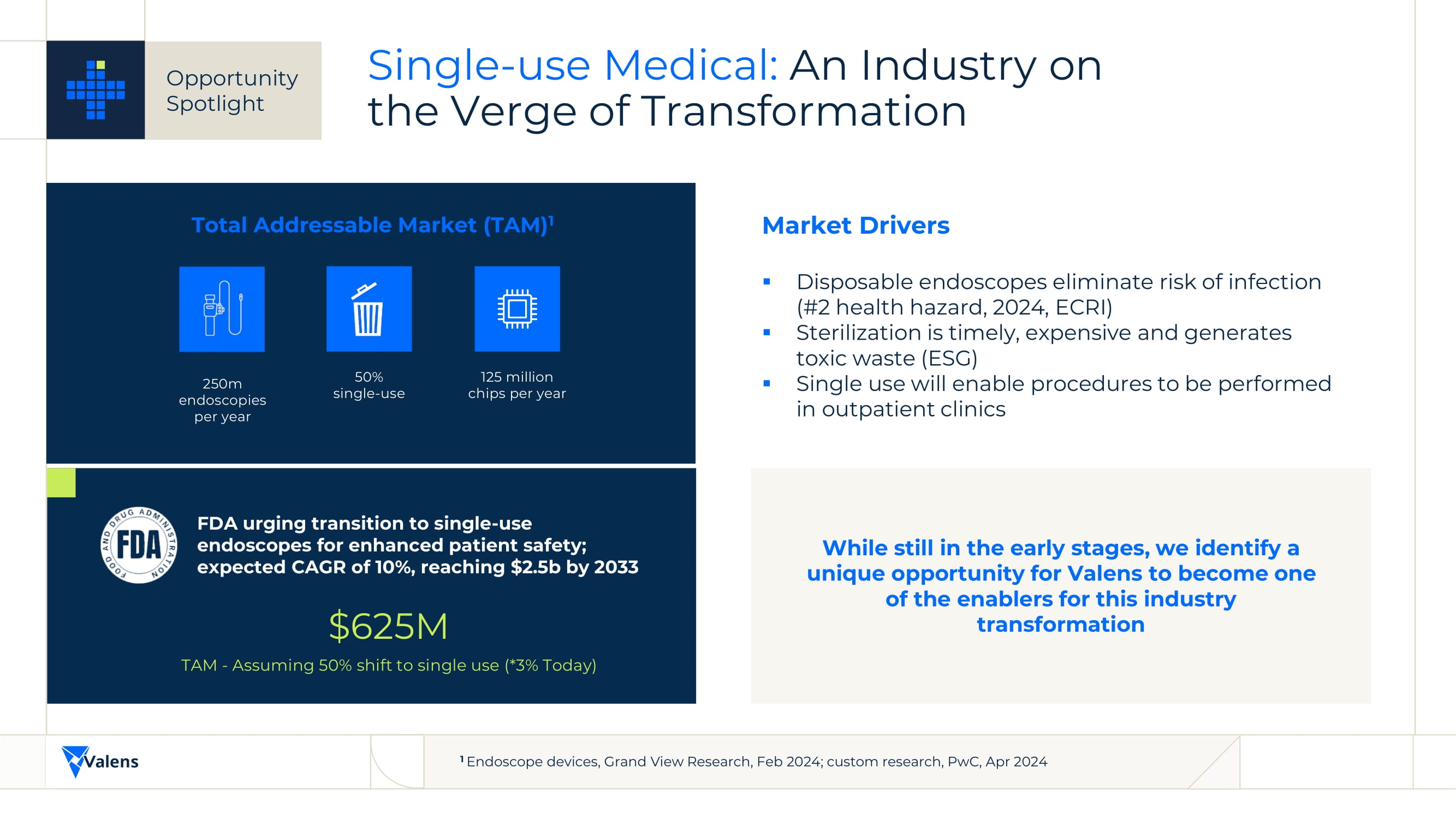 市场驱动因素▪一次性内窥镜消除感染风险(# 2健康危害,2024年,ECRI)▪灭菌及时、成本高且产生有毒废物(ESG)▪一次性使用将使手术能够在门诊进行6.25亿美元TAM-假设50%转向一次性使用(*今日3%)一次性使用医疗:一个处于转型边缘的行业1内窥镜设备,Grand View Research,2024年2月;定制研究,普华永道,2024年4月FDA敦促向一次性使用内窥镜过渡,以提高患者的安全性;预计CAGR为10%,到2033年达到$ 2.5b,同时仍处于早期阶段,我们确定了Valens成为这一行业转型推动者之一的独特机会总可寻址市场(TAM)1 250m内窥镜每年1.25亿个芯片每年50%一次性使用机会聚焦