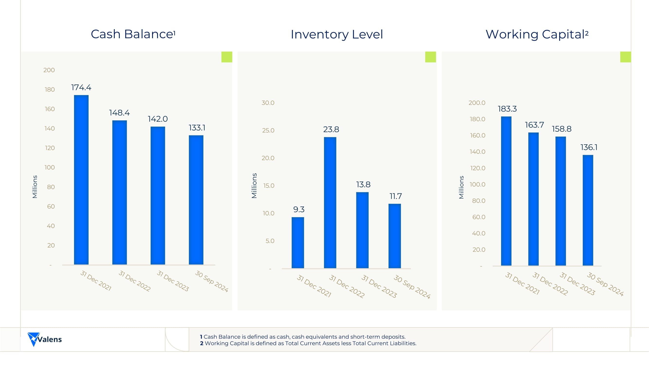 174.41 48.41 42.01 33.1-20406080100120140160180200百万9.32 3.81 3.81 1.7-5.0 10.01 5.02 0.02 5.03 0.0百万183.3163.7 158.81 36.1-120.0 100.08 0.06 0.04 0.02 0.01 40.01 40.01 60.01 80.0200000百万存货水平营运资本2现金余额11现金余额定义为现金、现金等价物和短期存款。2营运资本定义为流动资产总额减去流动负债总额。