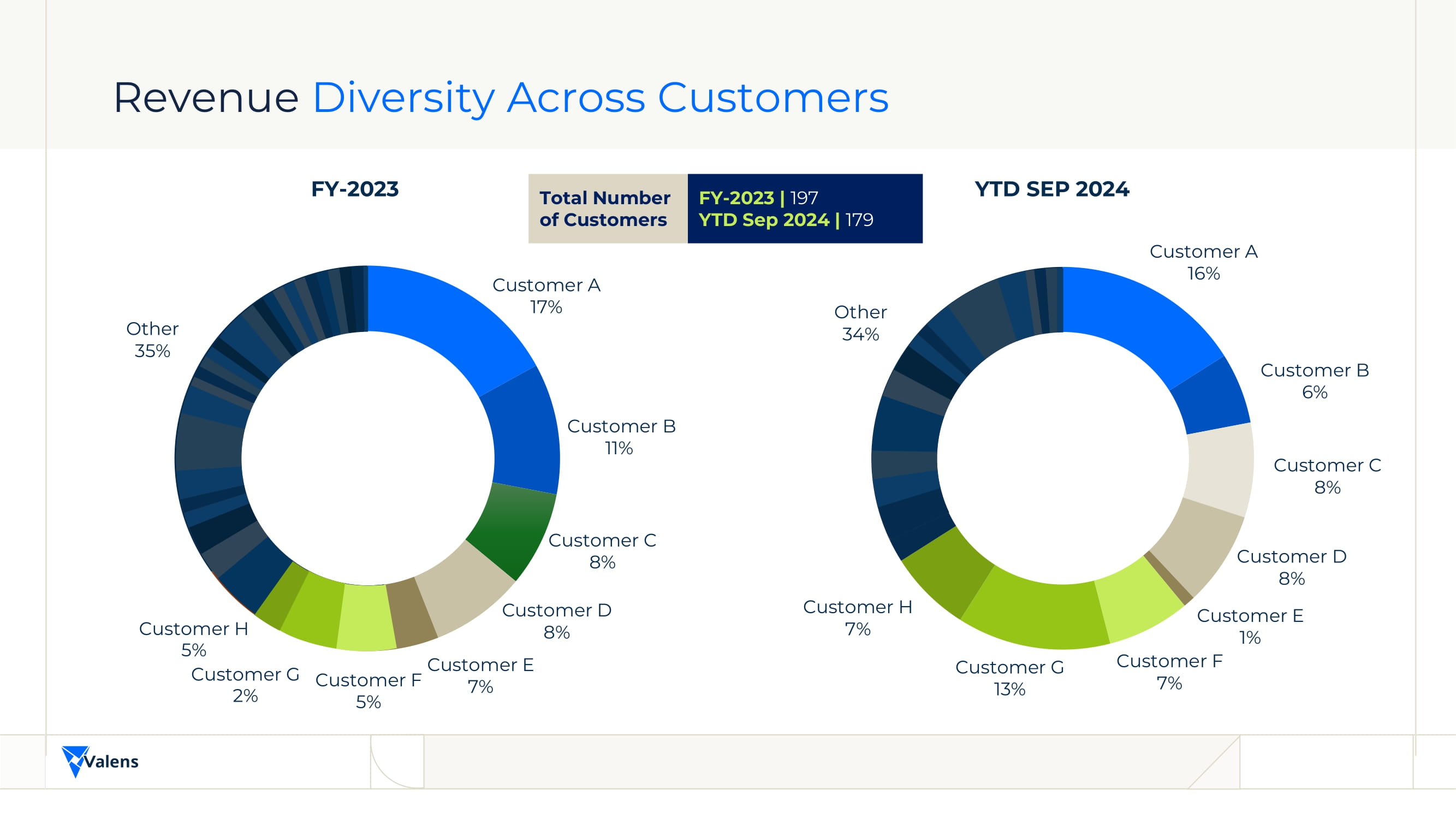 各客户年初至今2024财年9月-2023财年客户A 17%客户C 8%客户D 8%其他35%客户A 16%客户B 6%客户C 8%客户D 8%客户E 1%客户F 7%客户G 13%客户H 7%其他34%客户F 5%客户B 11% FY-2023 | 197年初至今2024年9月| 179客户总数客户E 7%客户H 5%客户G 2%